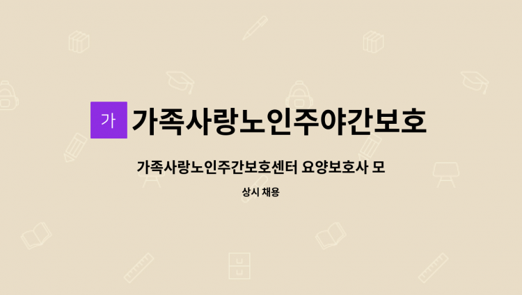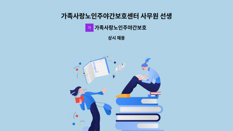 노인주간보호센터 사회복지사 모집 주간근무 (08:30~17:30) 주 5일근무 기관 내 분위기가 밝고 직원 간에 사이가 좋은 가족사랑노인주야간보호센터에서 새로운 식구가 될 사회복지사선생님을 구인합니다. 많은 지원 부탁드립니다.