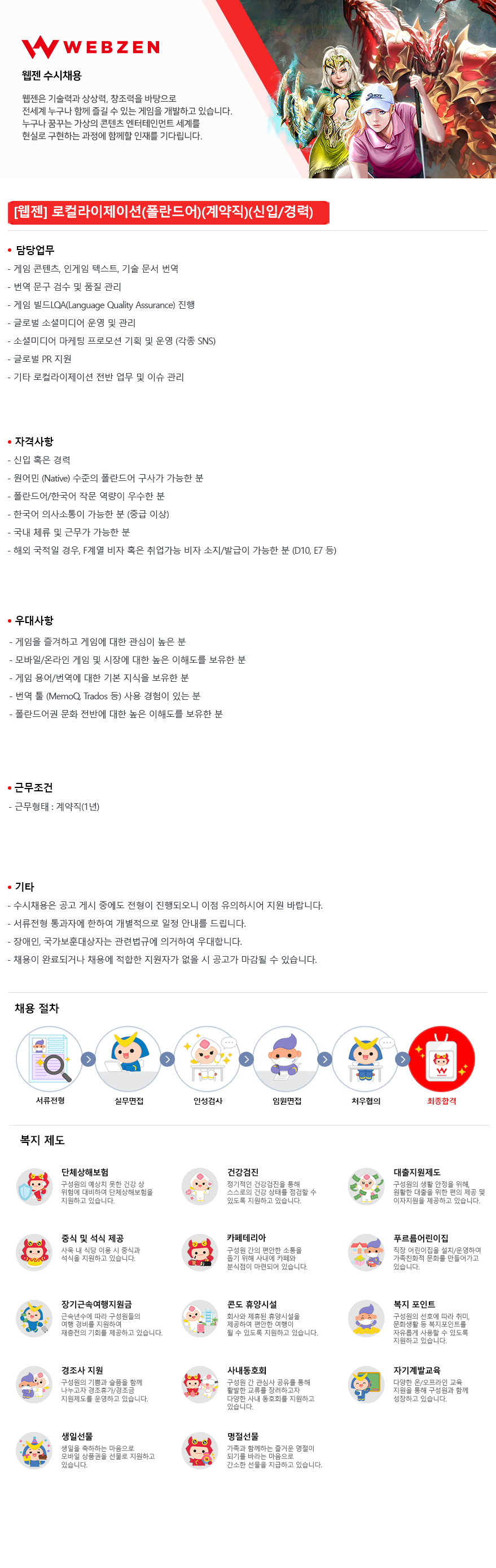 [웹젠] 로컬라이제이션(폴란드어)(계약직)(신입/경력) 채용