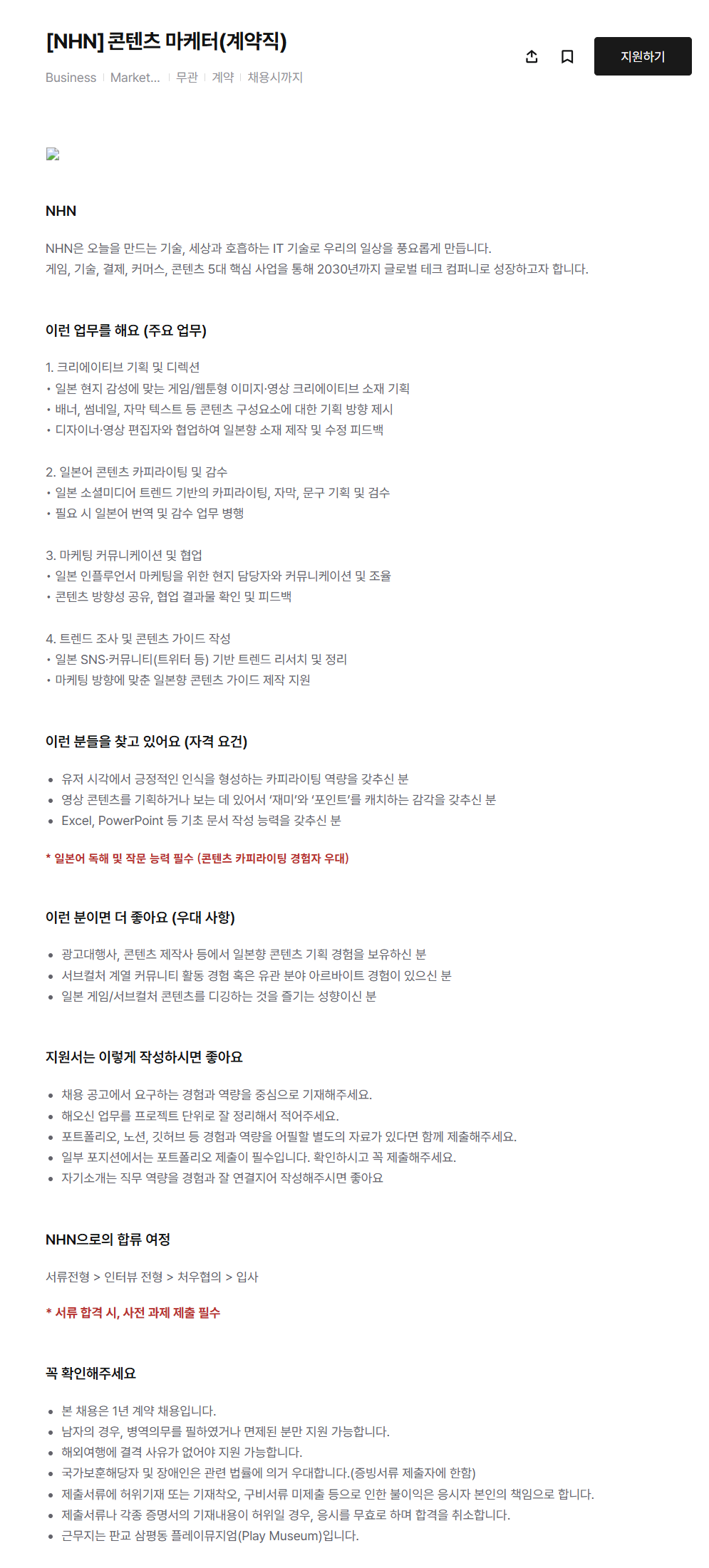 [NHN] 콘텐츠 마케터(계약직) 채용