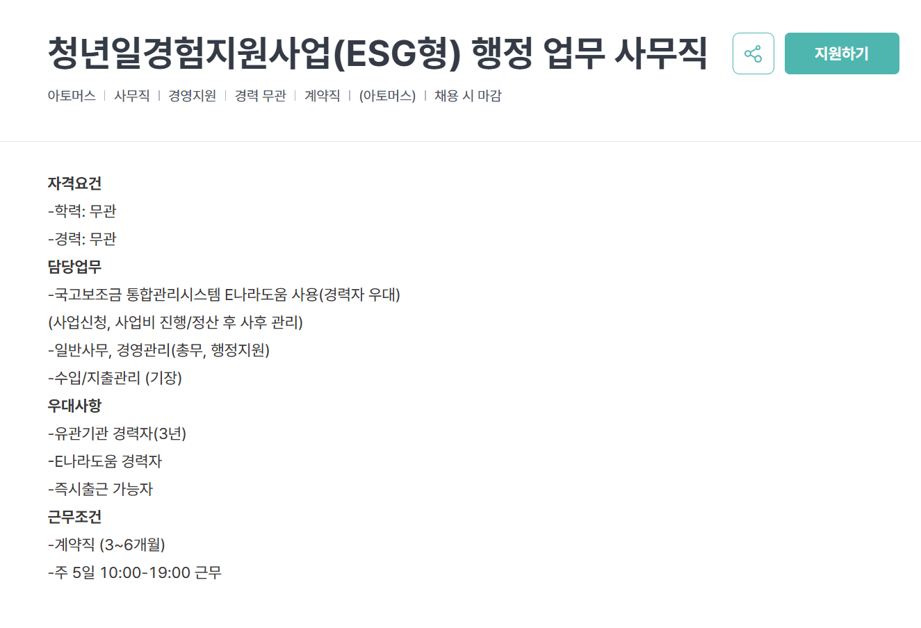 [아토머스] 청년일경험지원사업(ESG형) 행정 업무 사무직 채용