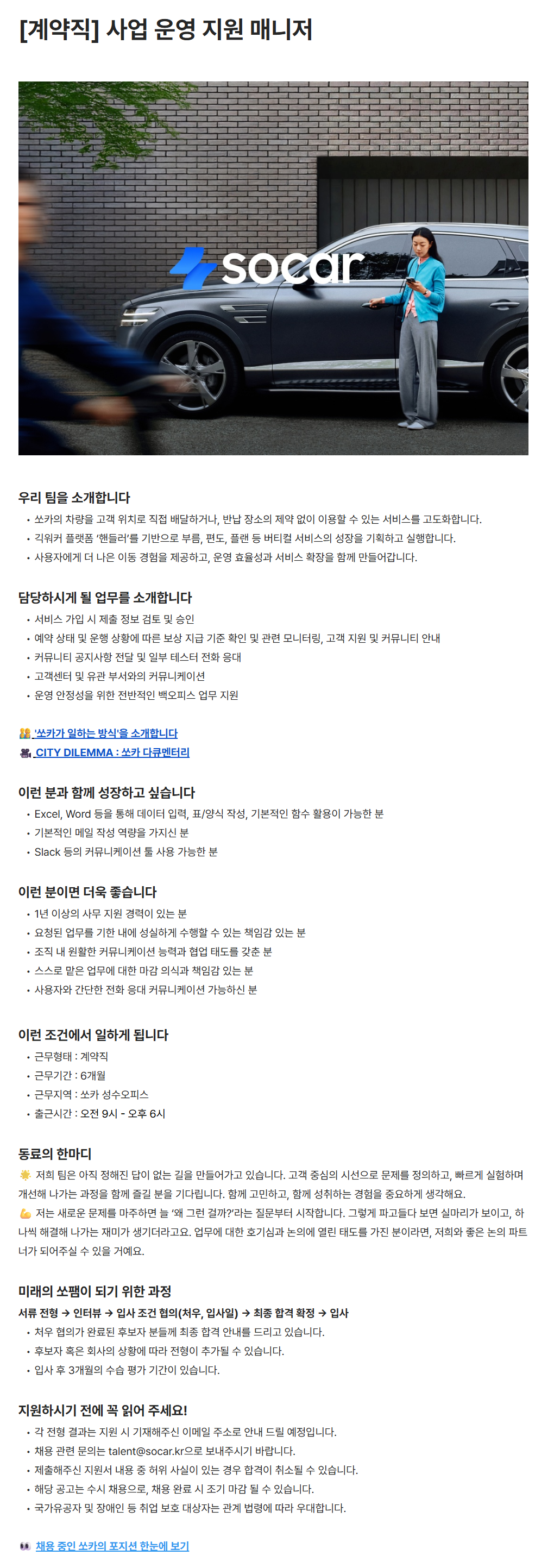 [쏘카] [계약직] 사업 운영 지원 매니저 채용