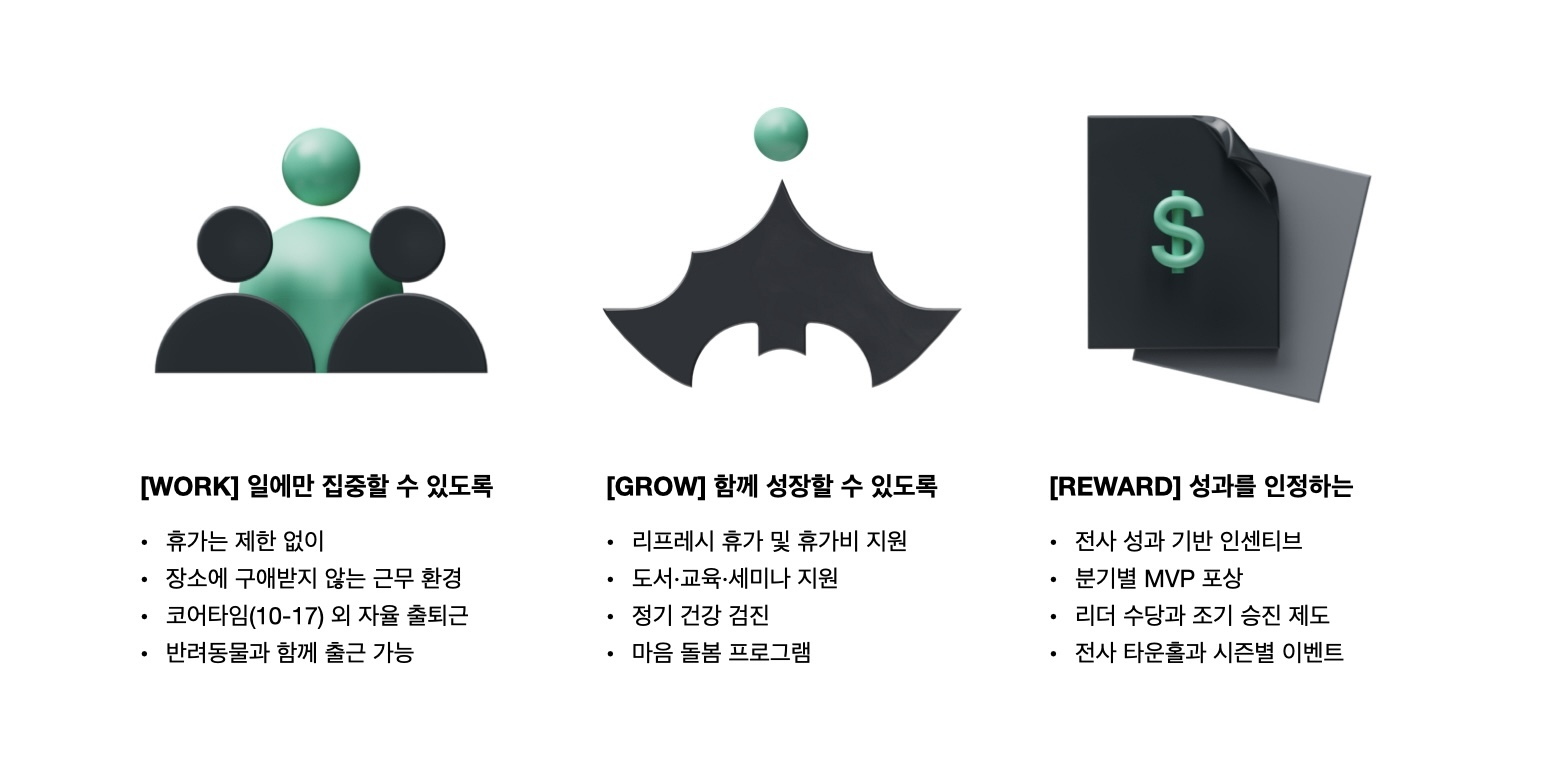 • 모든 포지션은 수습기간(3개월)을 거치며, 수습 기간에도 급여와 복지는 동일하게 적용돼요.