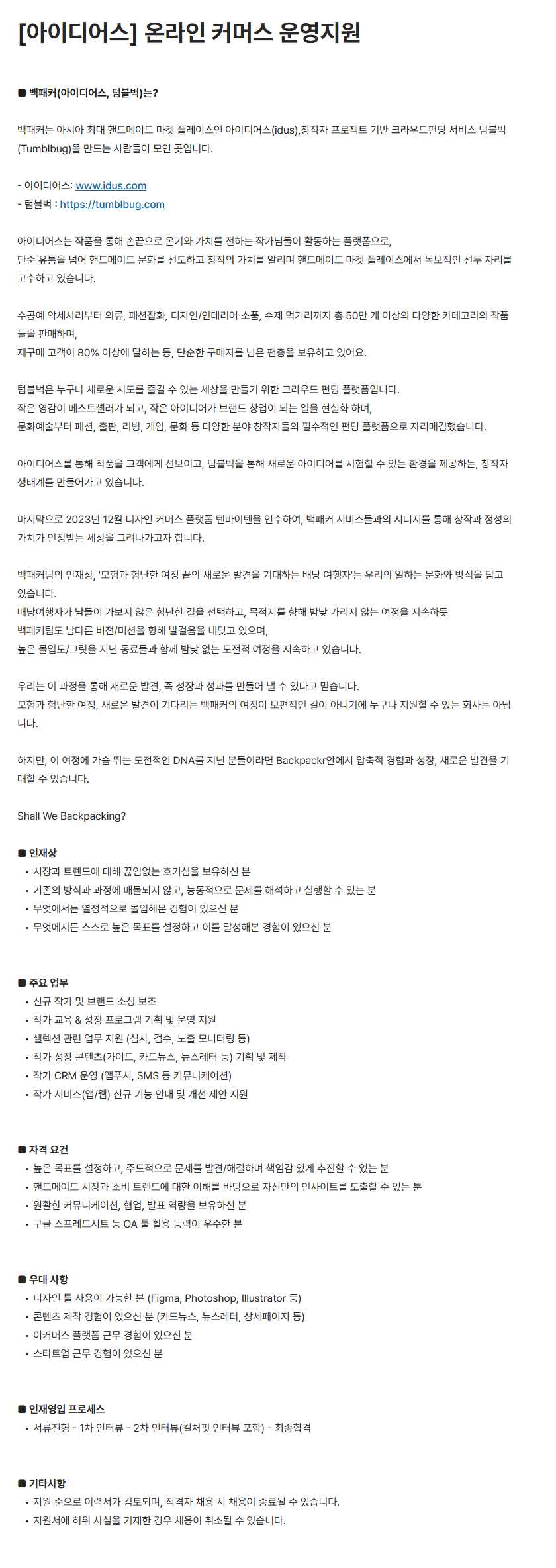 [백패커] [아이디어스] 온라인 커머스 운영지원 채용