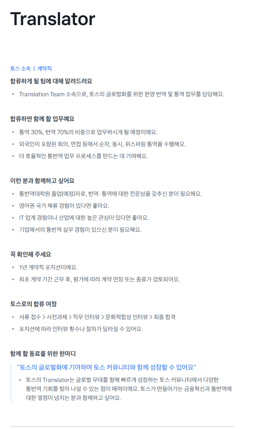- 통번역대학원 졸업(예정)자로, 번역·통역에 대한 전문성을 갖추신 분이 필요해요.