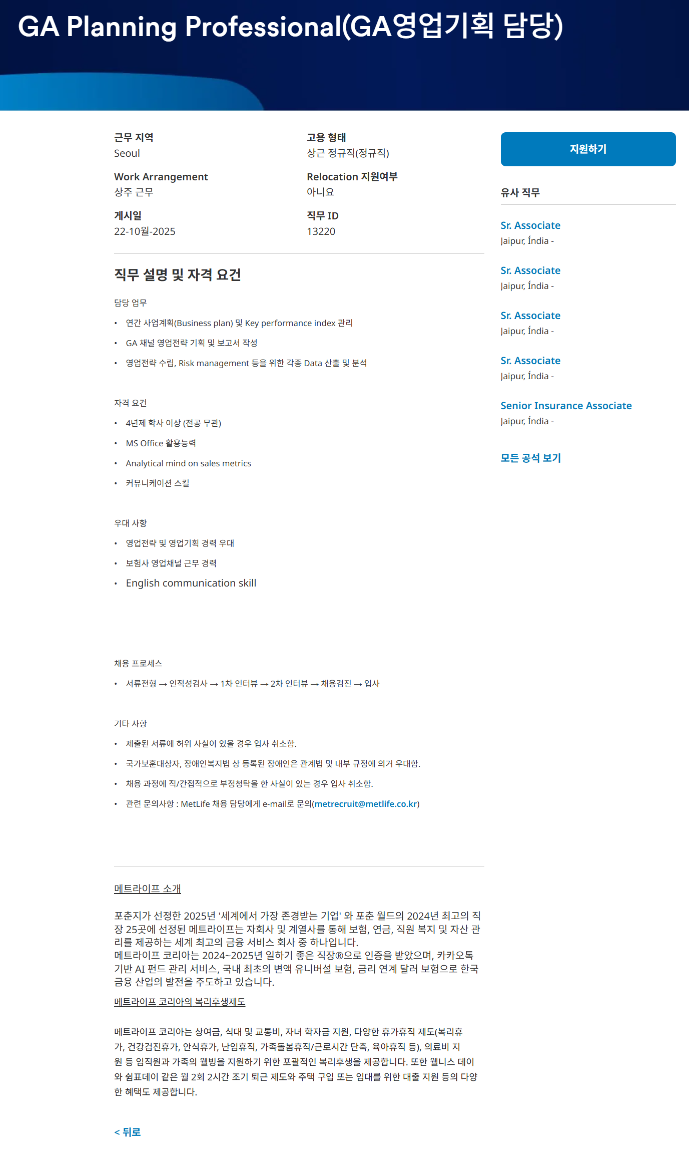 [메트라이프생명보험] GA Planning Professional(GA영업기획 담당)