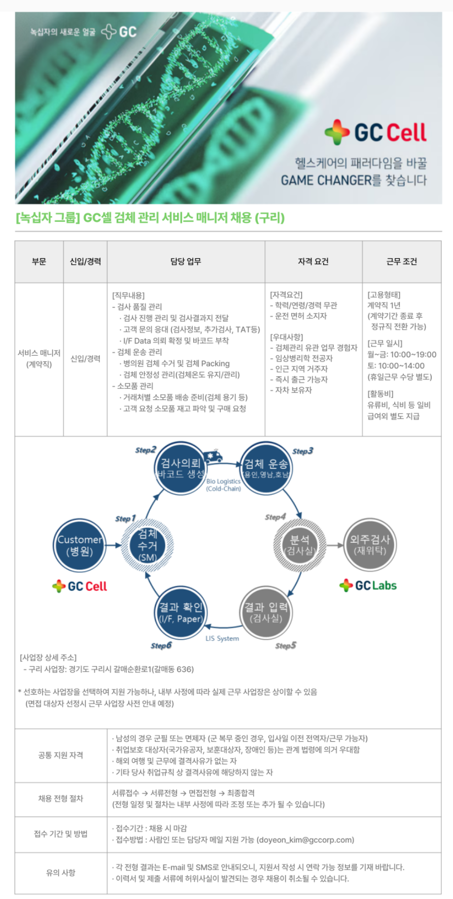 [GC셀] 검체 관리 서비스 매니저 채용 (구리)