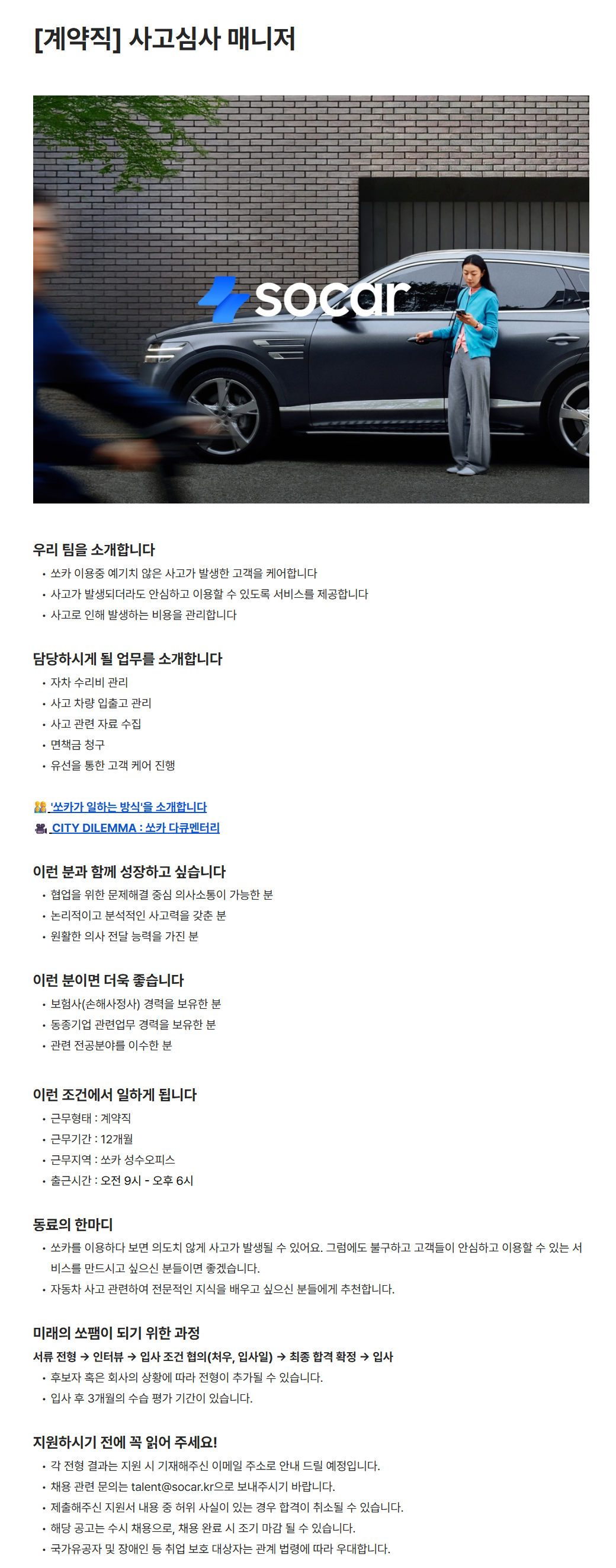 - 서류 전형 → 인터뷰 → 입사 조건 협의(처우, 입사일) → 최종 합격 확정 → 입사