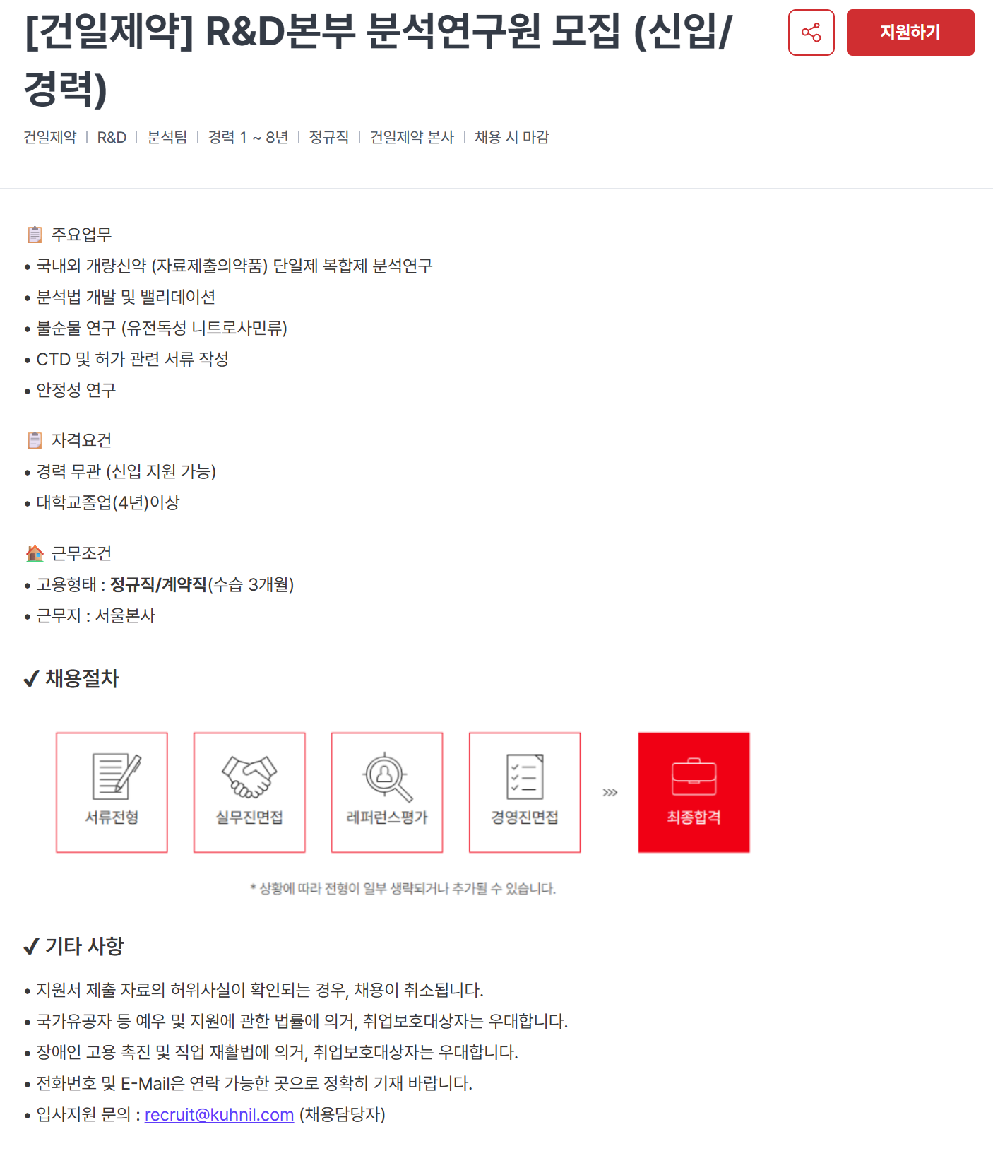[건일제약] R&D본부 분석연구원 모집 (신입/경력)