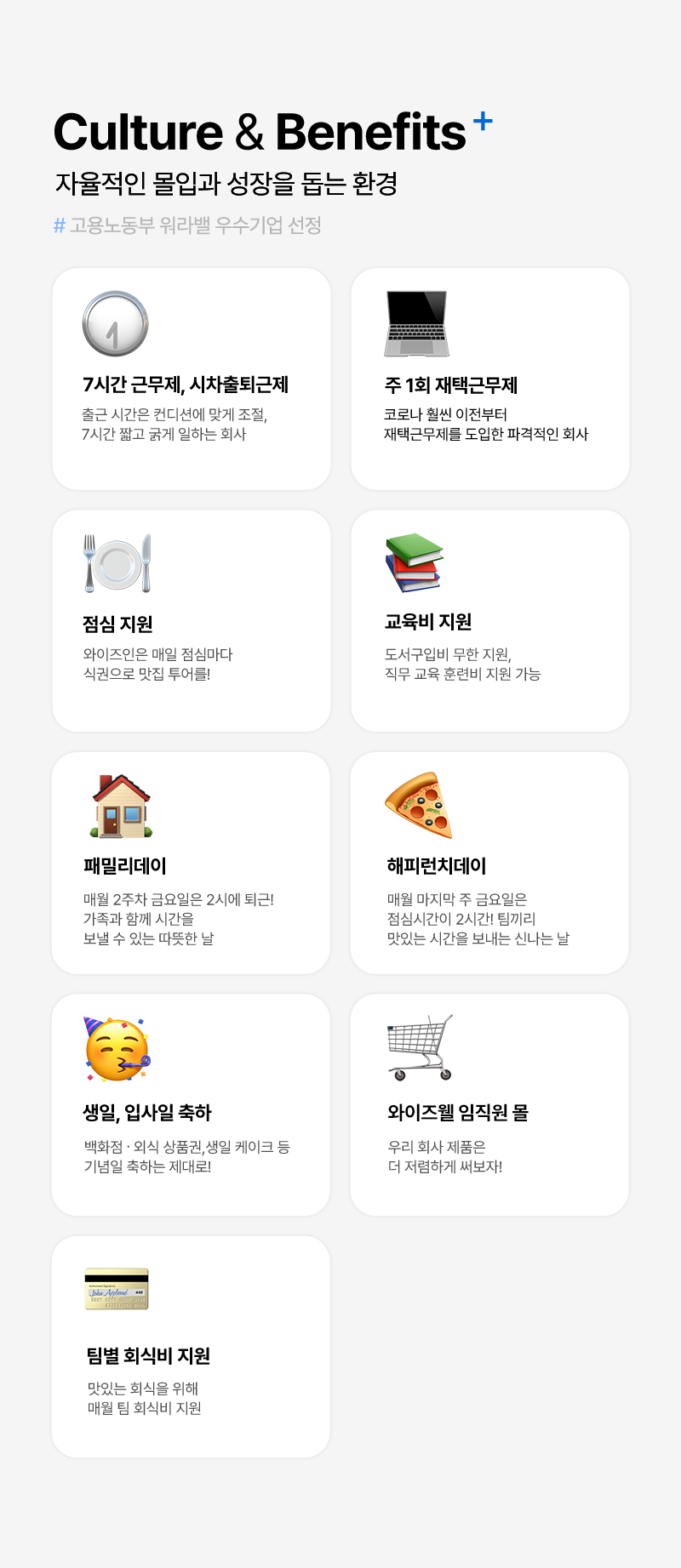· 둘째, 당장의 경험보다 태도를 더 중시합니다. 해 본 적 없는 일에 막히거나 실패해도 다시 개선하며 도전하면 된다는 믿음을 모두가 공유하고 있어요. 혼자서 해낼 수 없는 일이라면 주변에 함께해 줄 든든한 동료들이 많이 있으니, 두려워하지 않으셨으면 합니다.