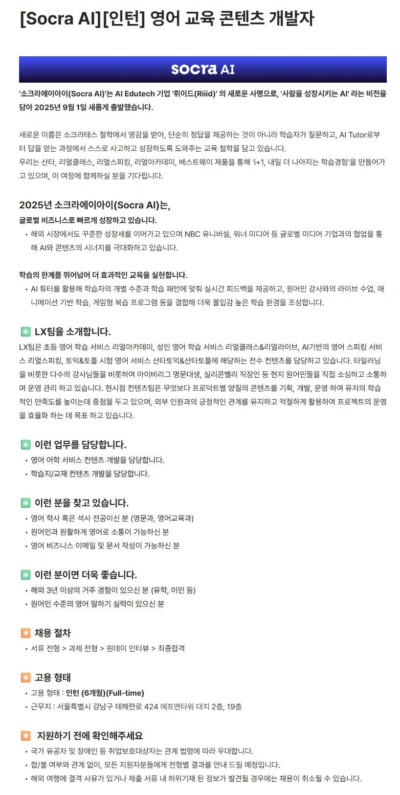 [소크라에이아이] [인턴] 영어 교육 콘텐츠 개발자