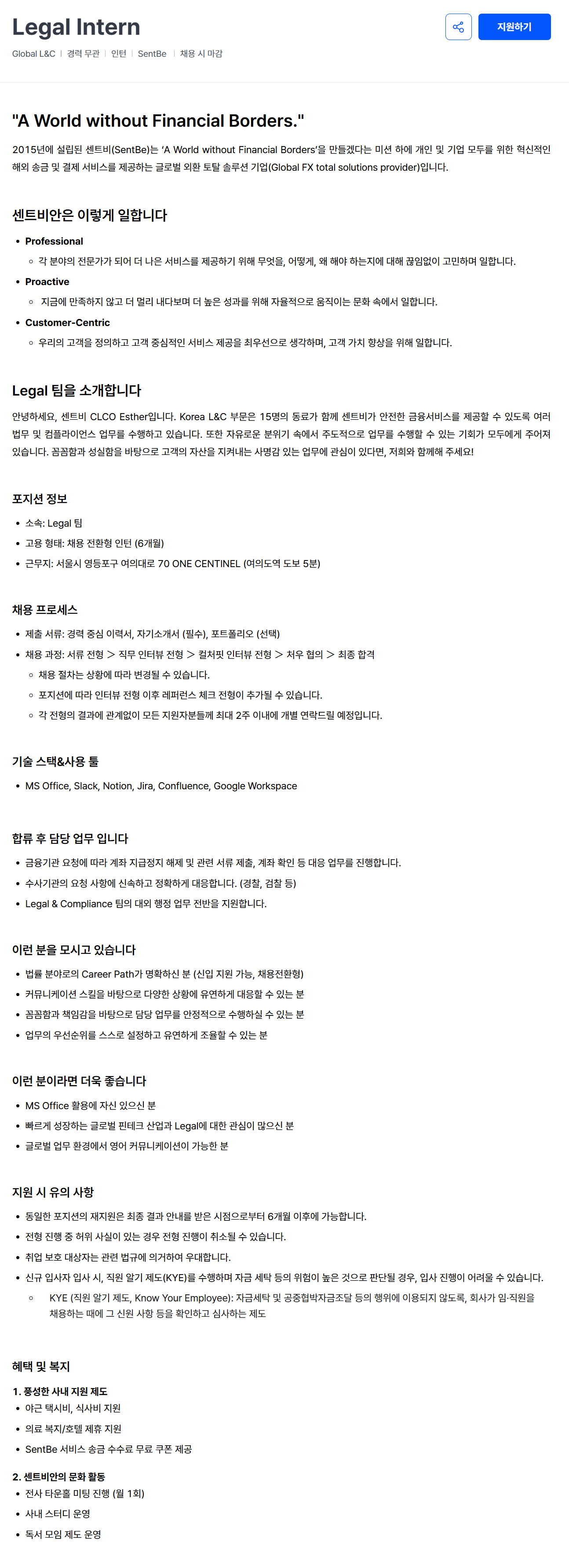 - 법률 분야로의 Career Path가 명확하신 분 (신입 지원 가능, 채용전환형)