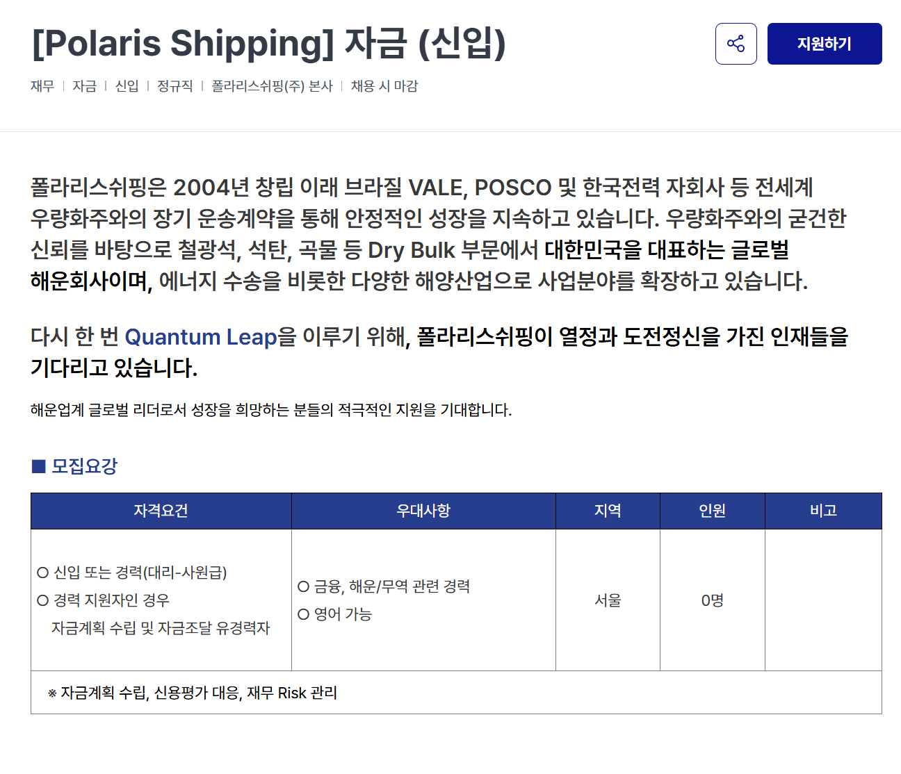 [폴라리스쉬핑] 자금 (신입) 채용