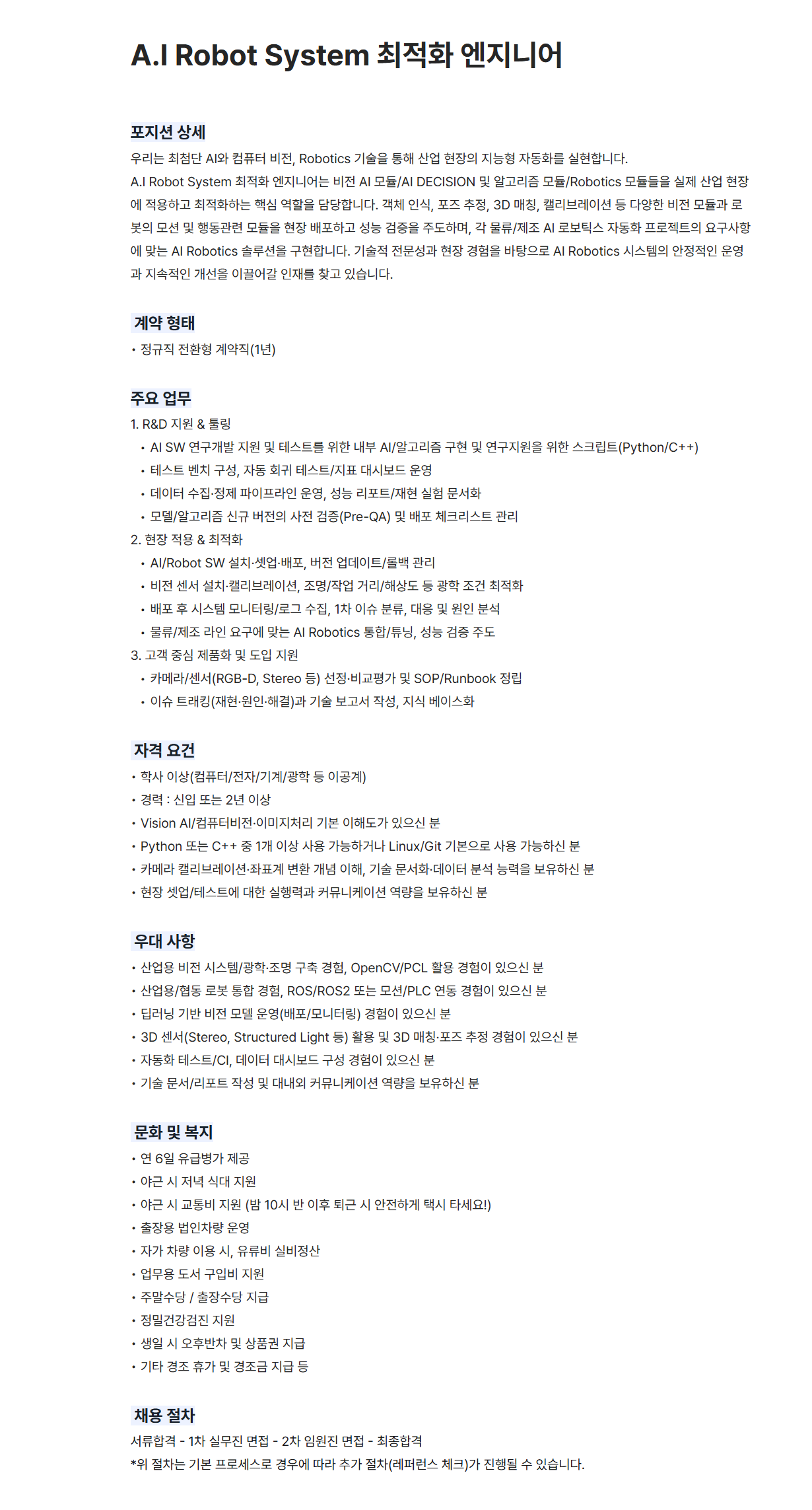A.I Robot System 최적화 엔지니어(1년 계약직 후 정규직 전환 가능)