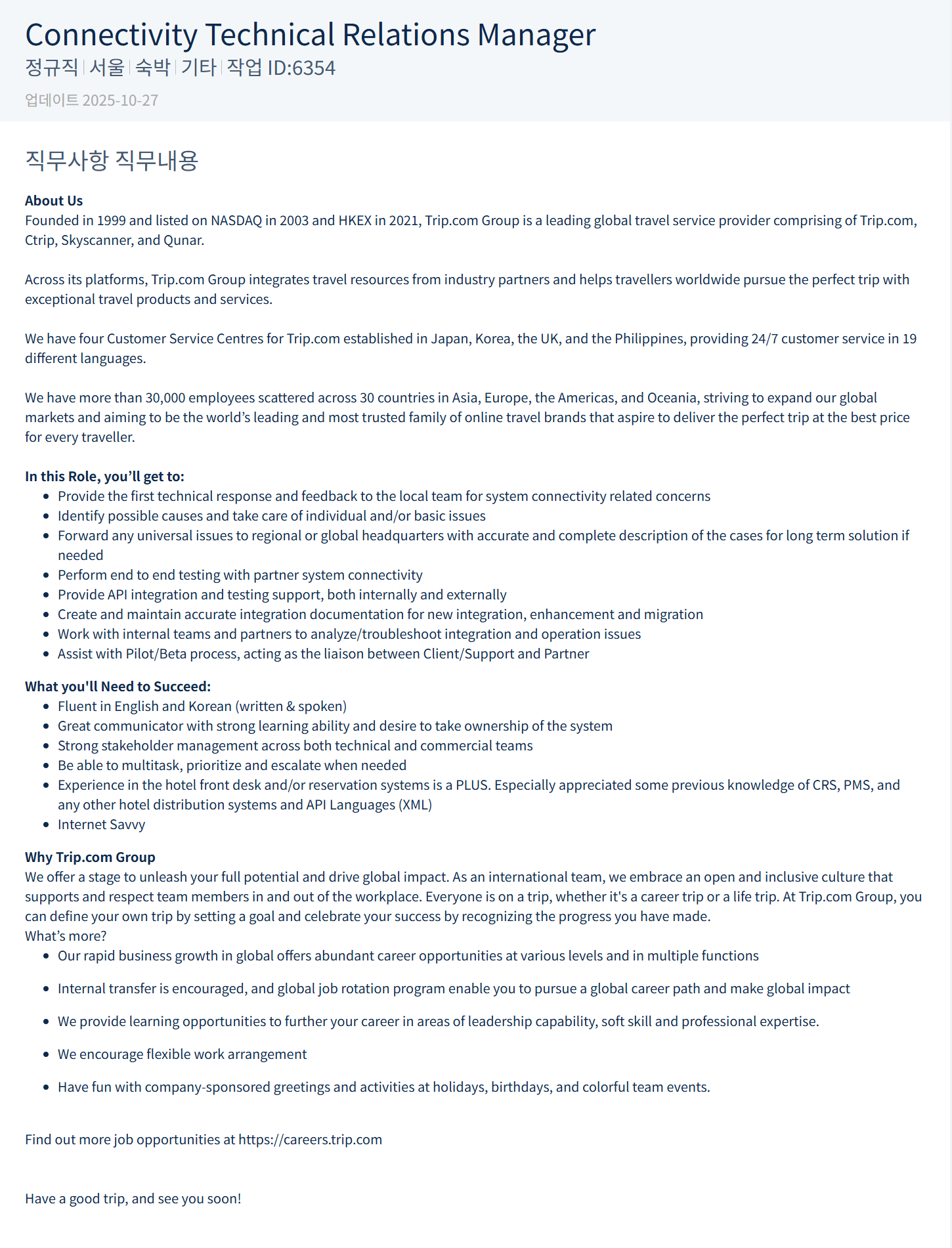 [트립닷컴코리아] Connectivity Technical Relations Manager 채용