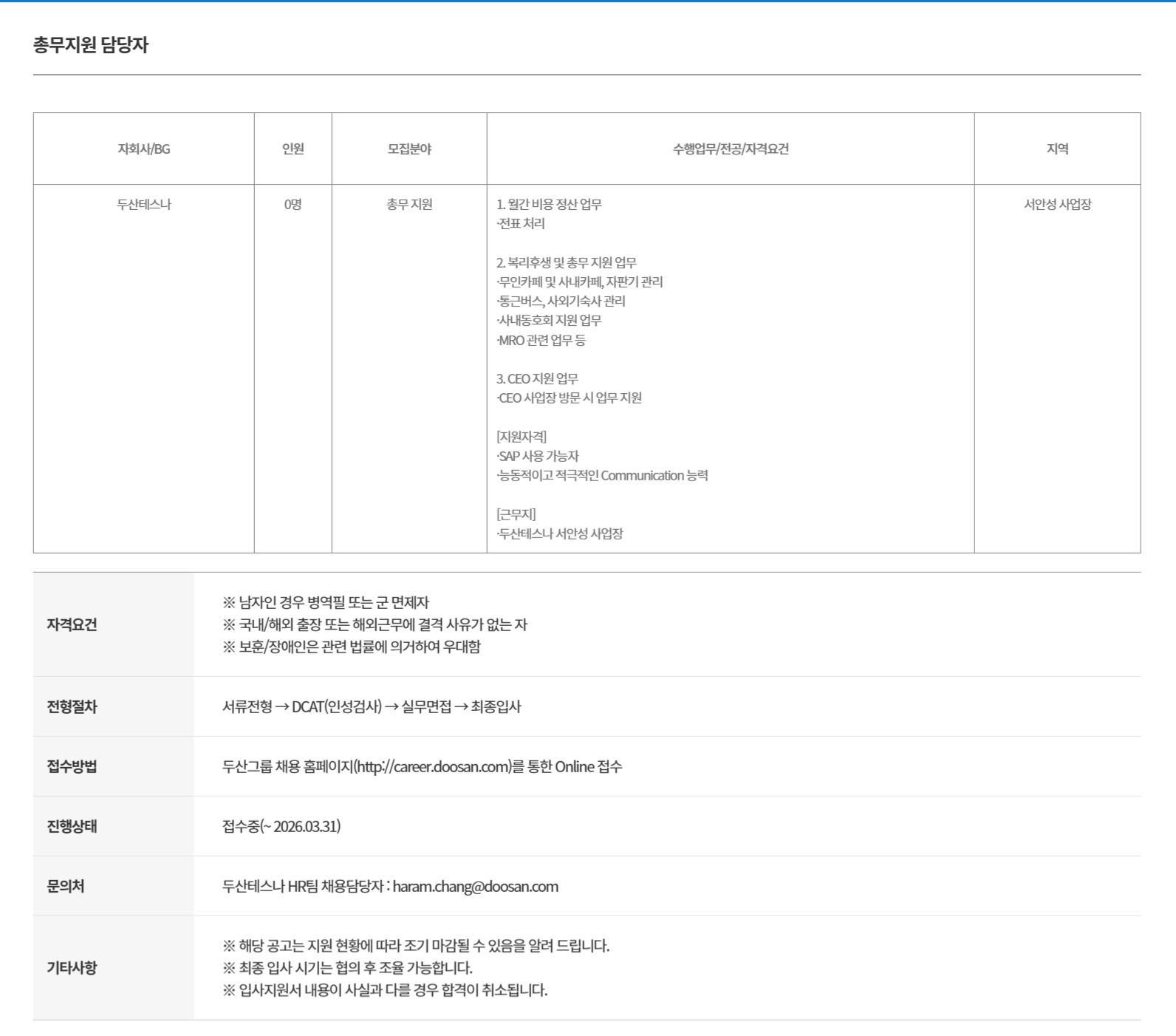 [두산테스나] 총무지원 담당자 채용