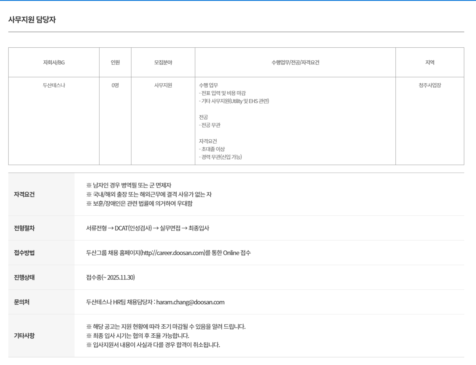 [두산테스나] 사무지원 담당자 채용