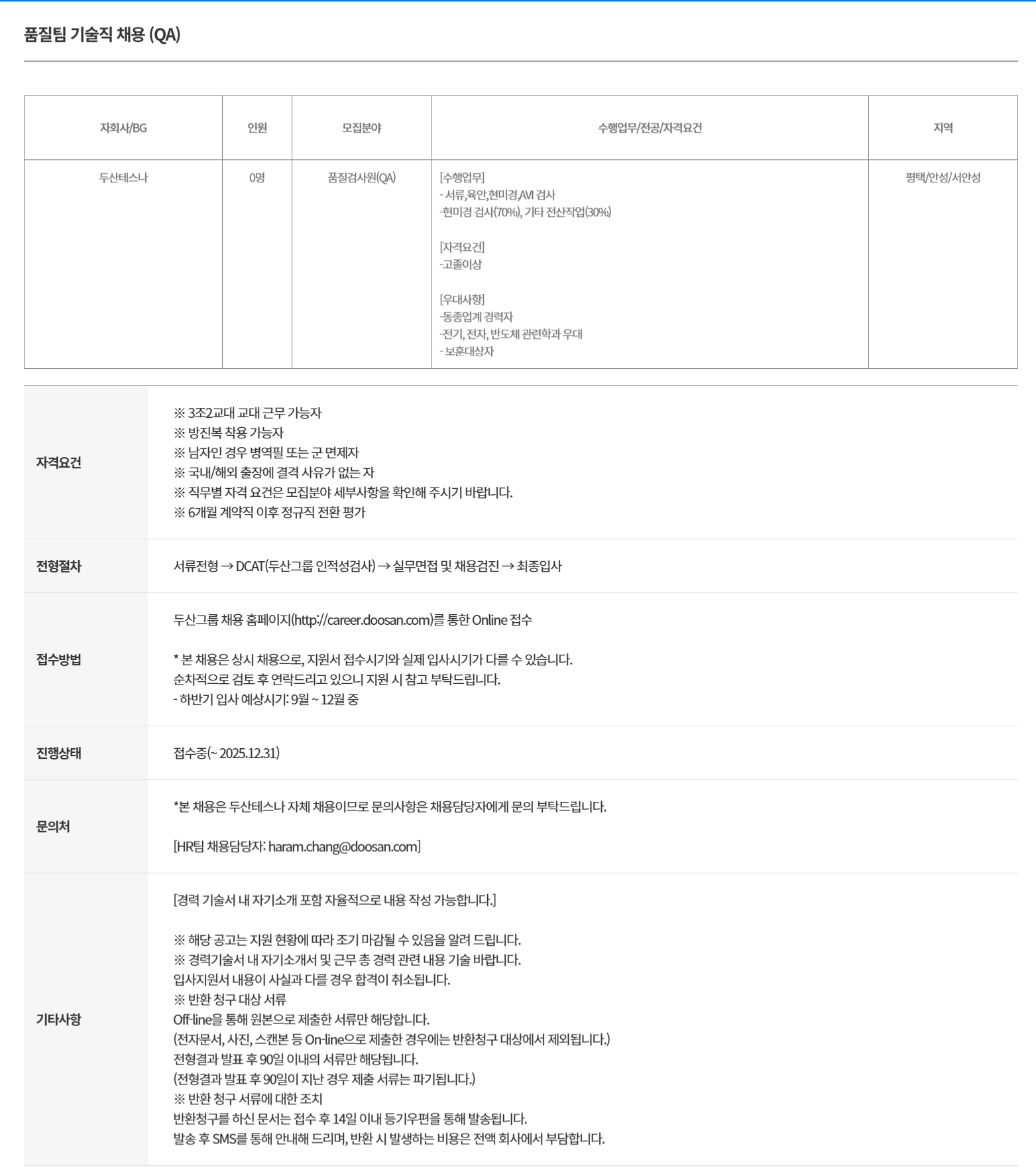 [두산테스나] 품질팀 기술직 (QA) 채용