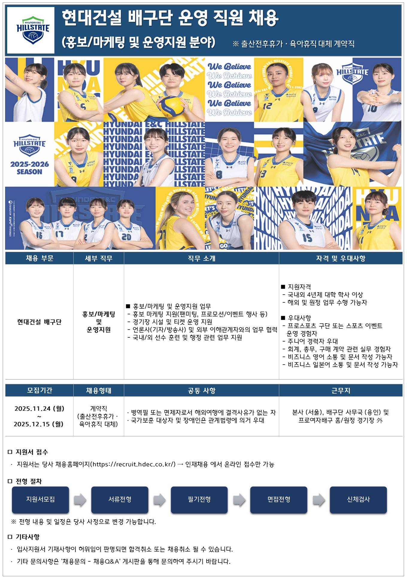 [현대건설] 힐스테이트 배구단 운영 직원 채용