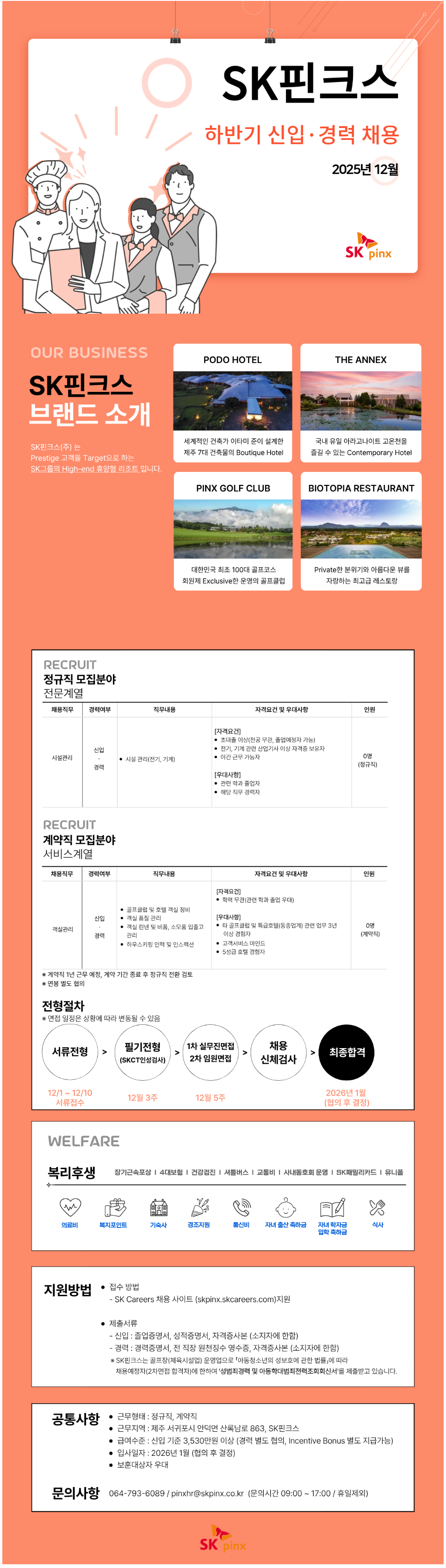 - 서류전형 > 필기전형 (SKCT 인성검사) > 1차 실무진 면접 > 2차 임원면접 > 채용신체검사 > 최종합격