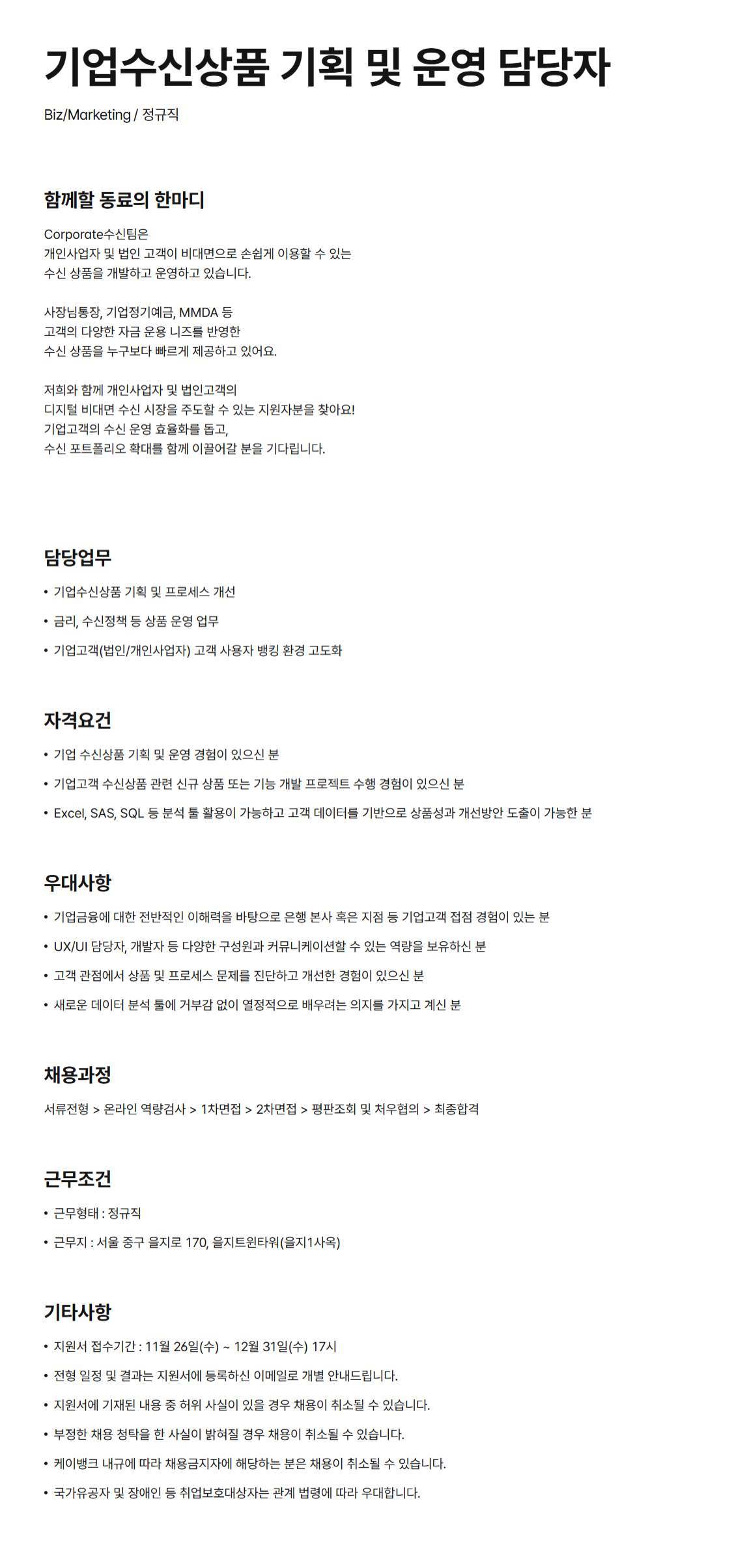 [케이뱅크] 기업수신상품 기획 및 운영 담당자 채용