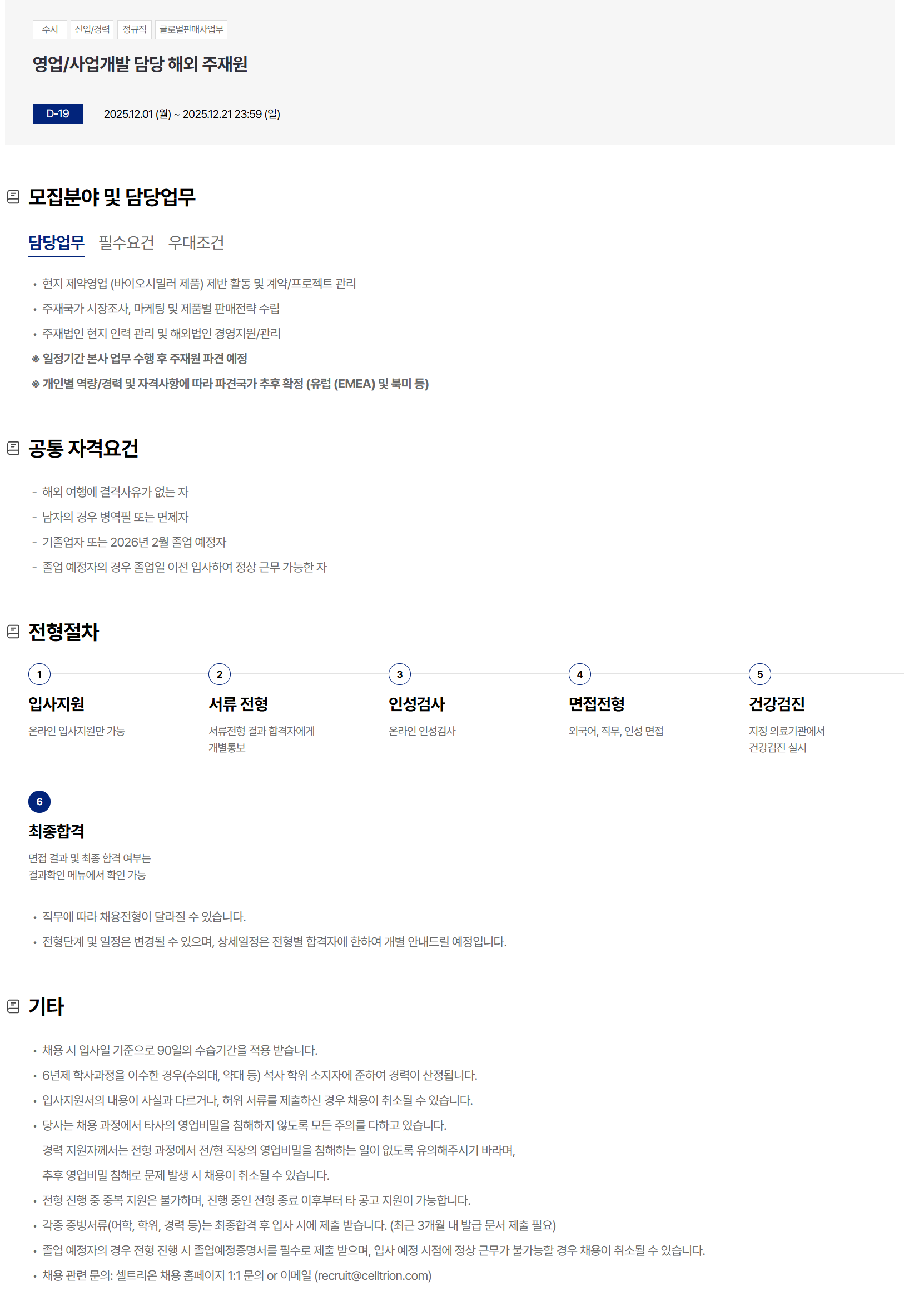 [셀트리온] 영업/사업개발 담당 해외 주재원