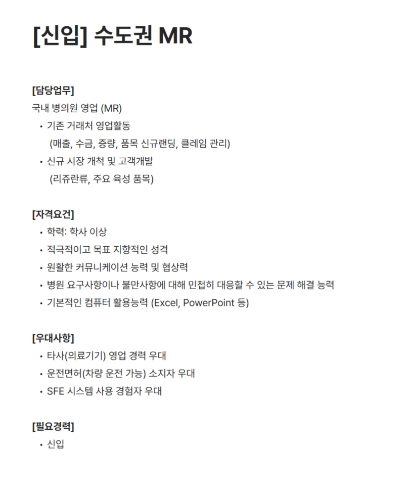 [우대사항] - 타사(의료기기) 영업 경력 우대 - 운전면허(차량 운전 가능) 소지자 우대 - SFE 시스템 사용 경험자 우대