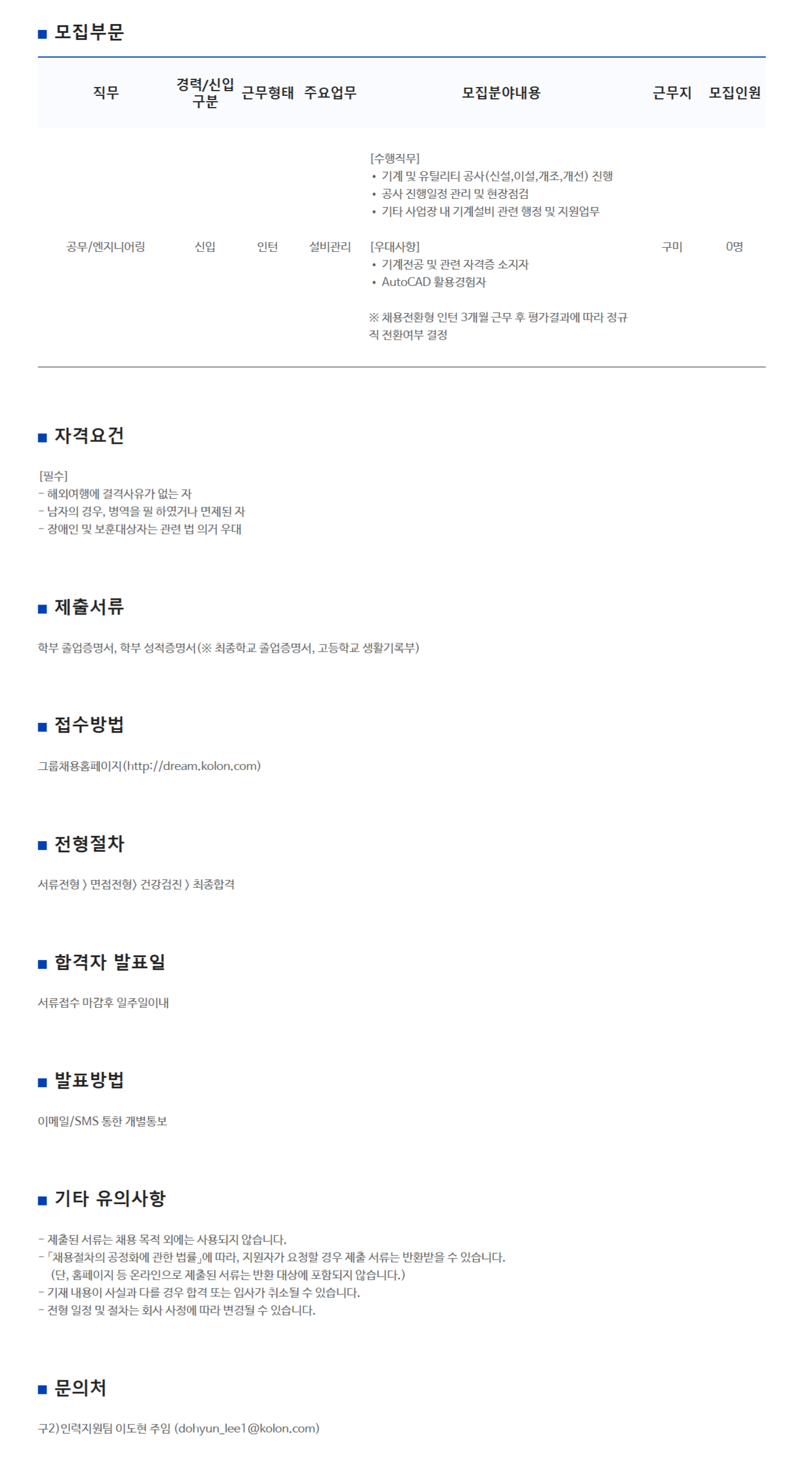[코오롱인더스트리]기능직 채용전환형 인턴 채용(구미2공장)