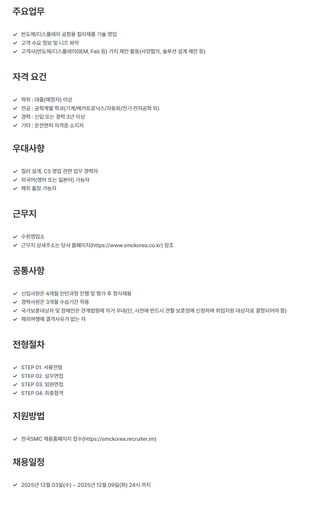 ![FireShot Capture 1322 - 한국에스엠씨(주) 채용ㅣ채용사이트 - [한국SMC] 칠러 부문 기술영업직 신입_경력 채용(수원영업소)_ - [smckorea.recruiter.im].png](/includes/uploads/extra_recruit/6a8f7088-72bd-4f83-91ea-beddeb916945_20251204174339.png)