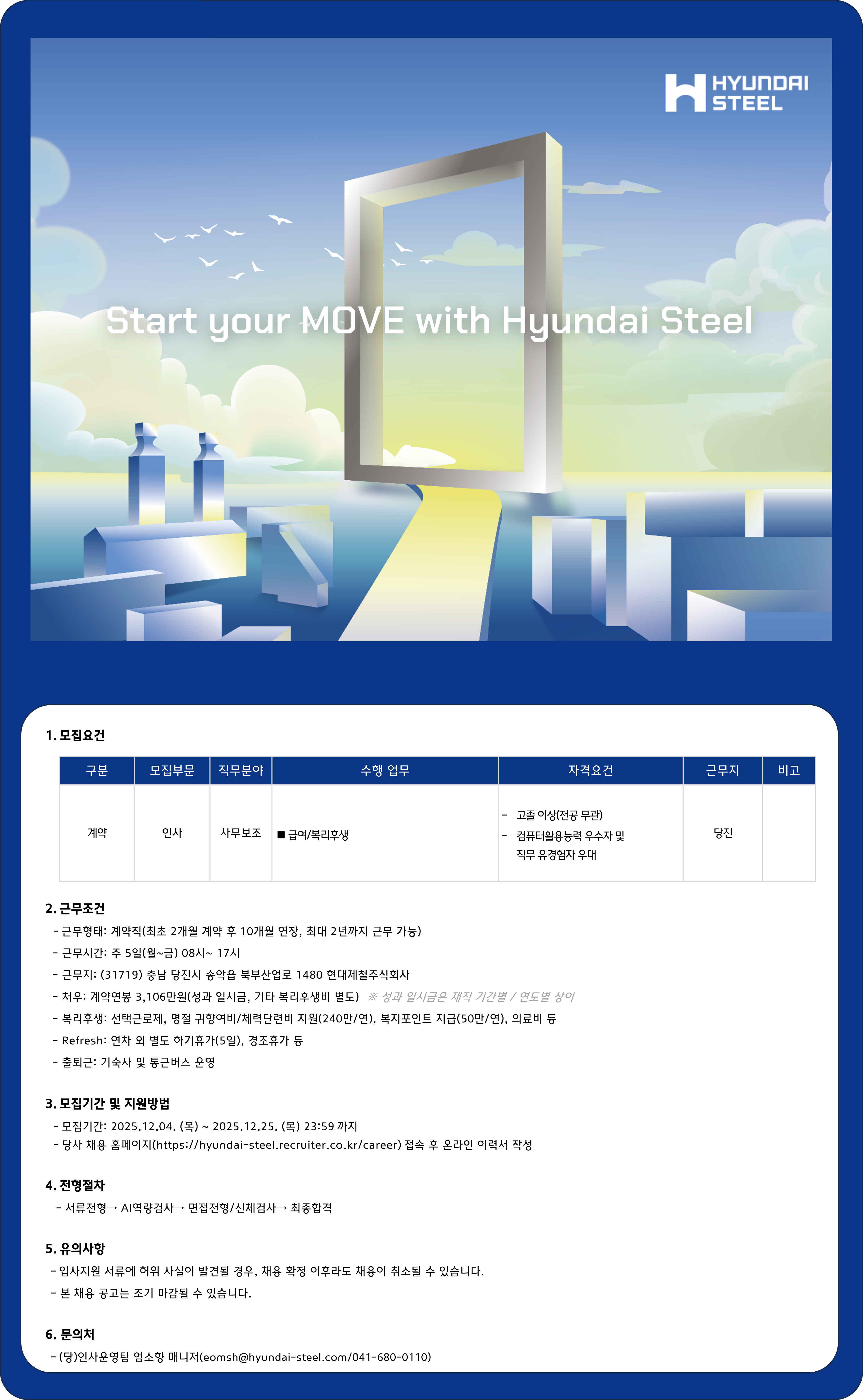 [현대제철] 인사 사무보조 계약직 채용 (당진)