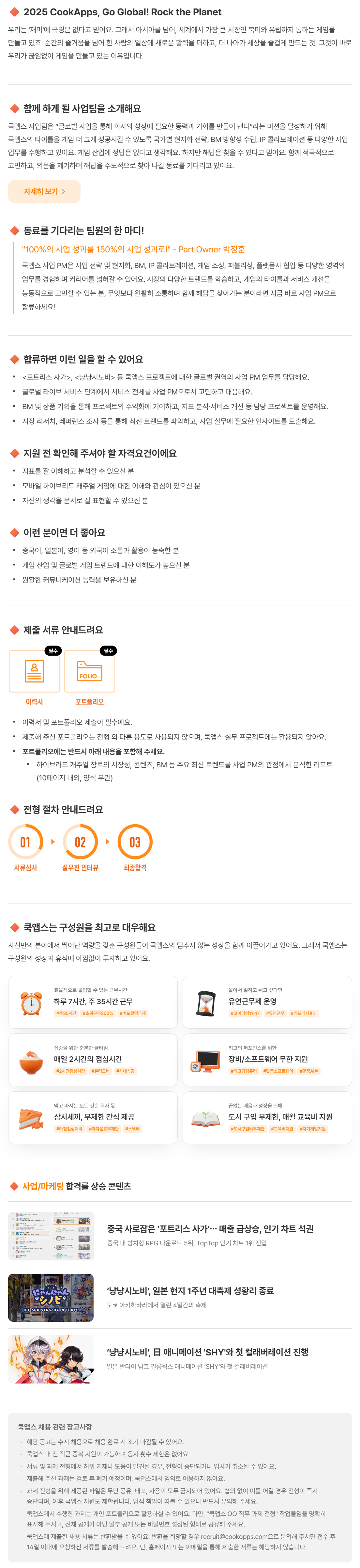 - <포트리스 사가>, <냥냥시노비> 등 쿡앱스 프로젝트에 대한 글로벌 권역의 사업 PM 업무를 담당해요.