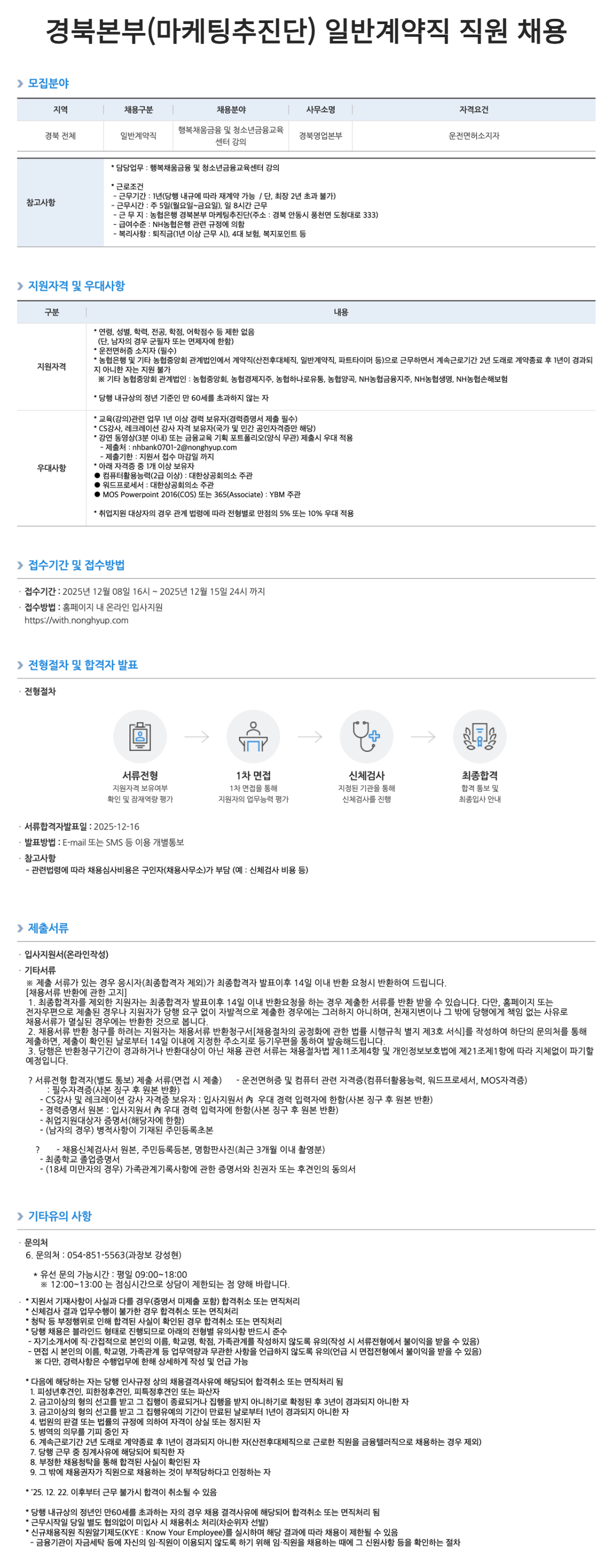 - 근 무 지 : 농협은행 경북본부 마케팅추진단(주소 : 경북 안동시 풍천면 도청대로 333)