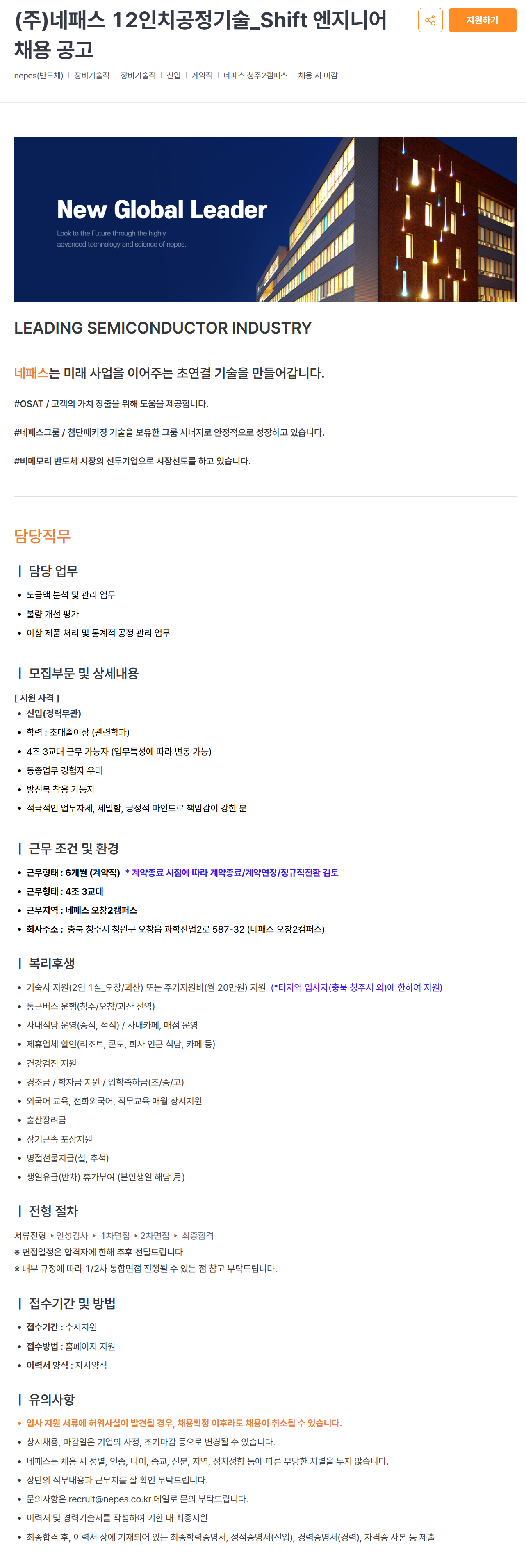 [네패스] 12인치공정기술_Shift 엔지니어 채용 공고