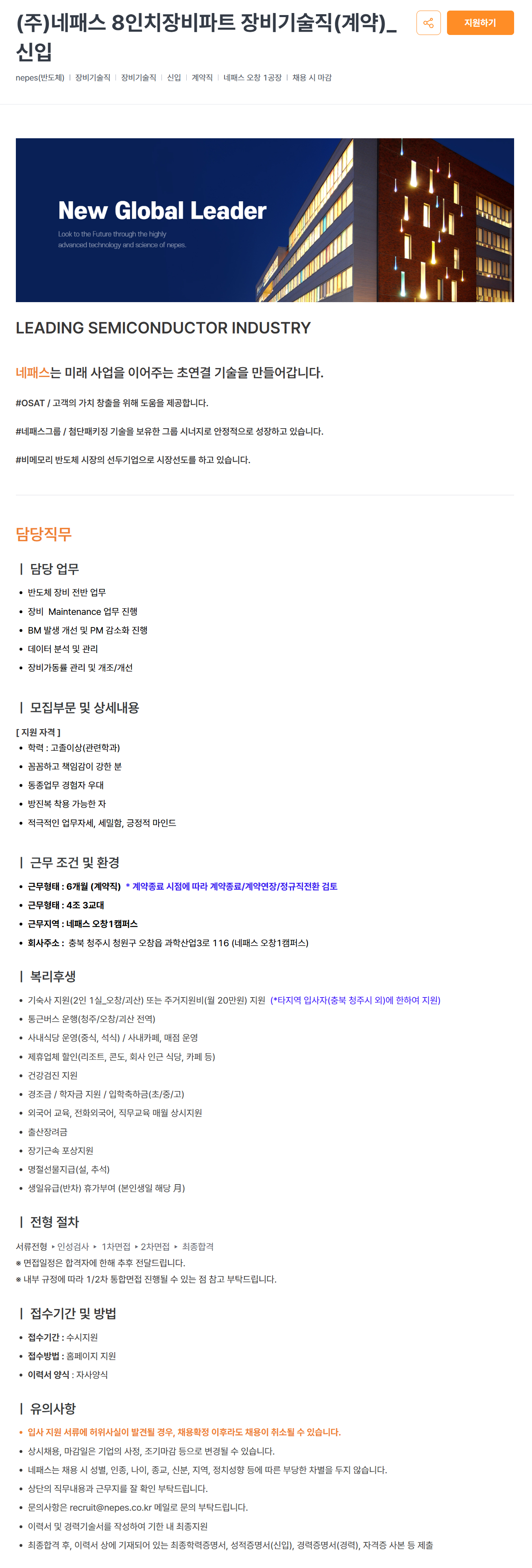 [네패스] 8인치장비파트 장비기술직(계약)_신입 채용 공고