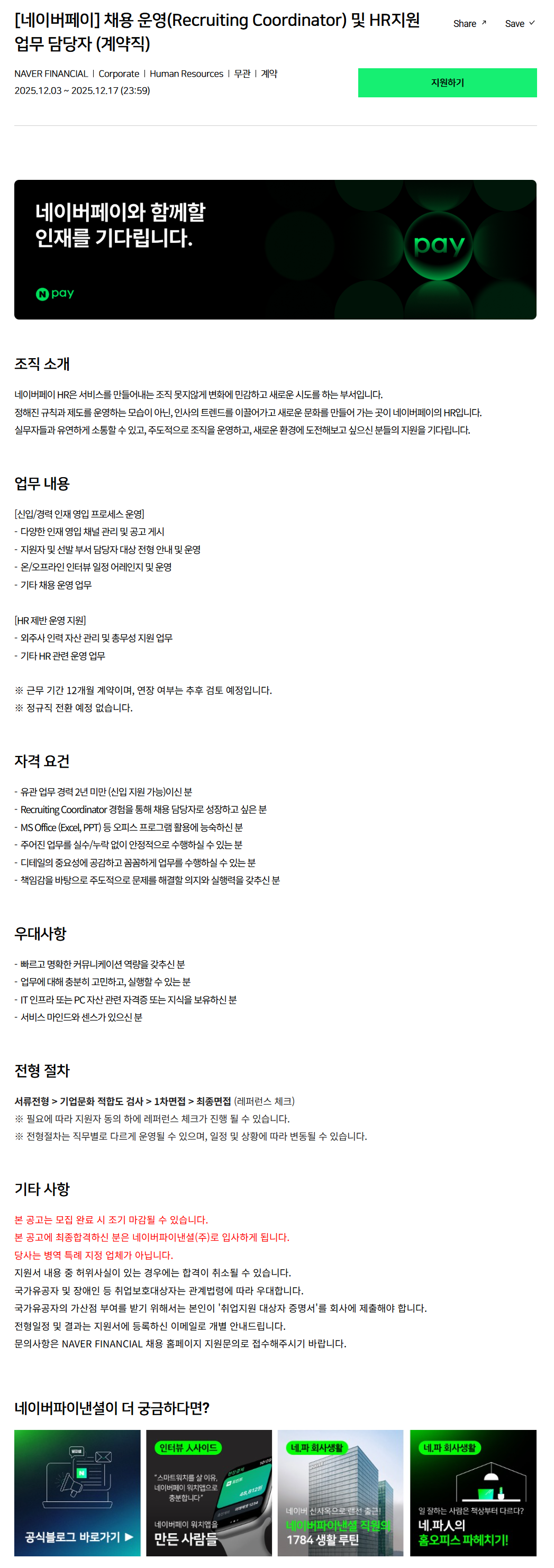 [네이버페이] 채용 운영(Recruiting Coordinator) 및 HR지원 업무 담당자 (계약직)