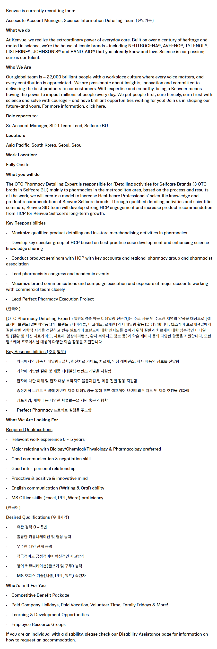 [한국존슨앤드존슨판매(켄뷰코리아)] 일반의약품 약국 디테일링 전문가(OTC Pharmacy Detailing Expert) 채용