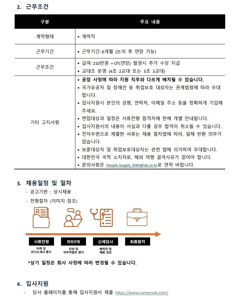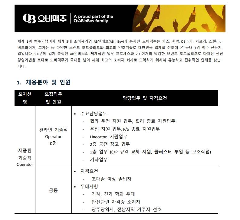 [오비맥주] 광주공장 제품팀(캔라인) 계약직 수시채용