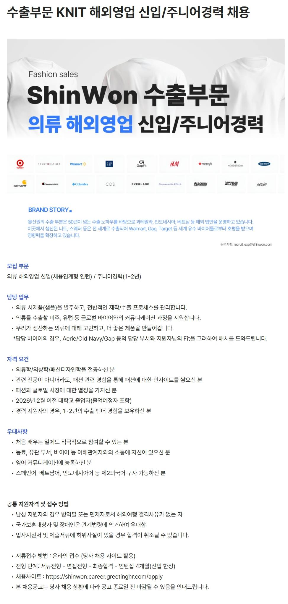 [신원] 수출부문 KNIT 해외영업 신입/주니어경력 채용