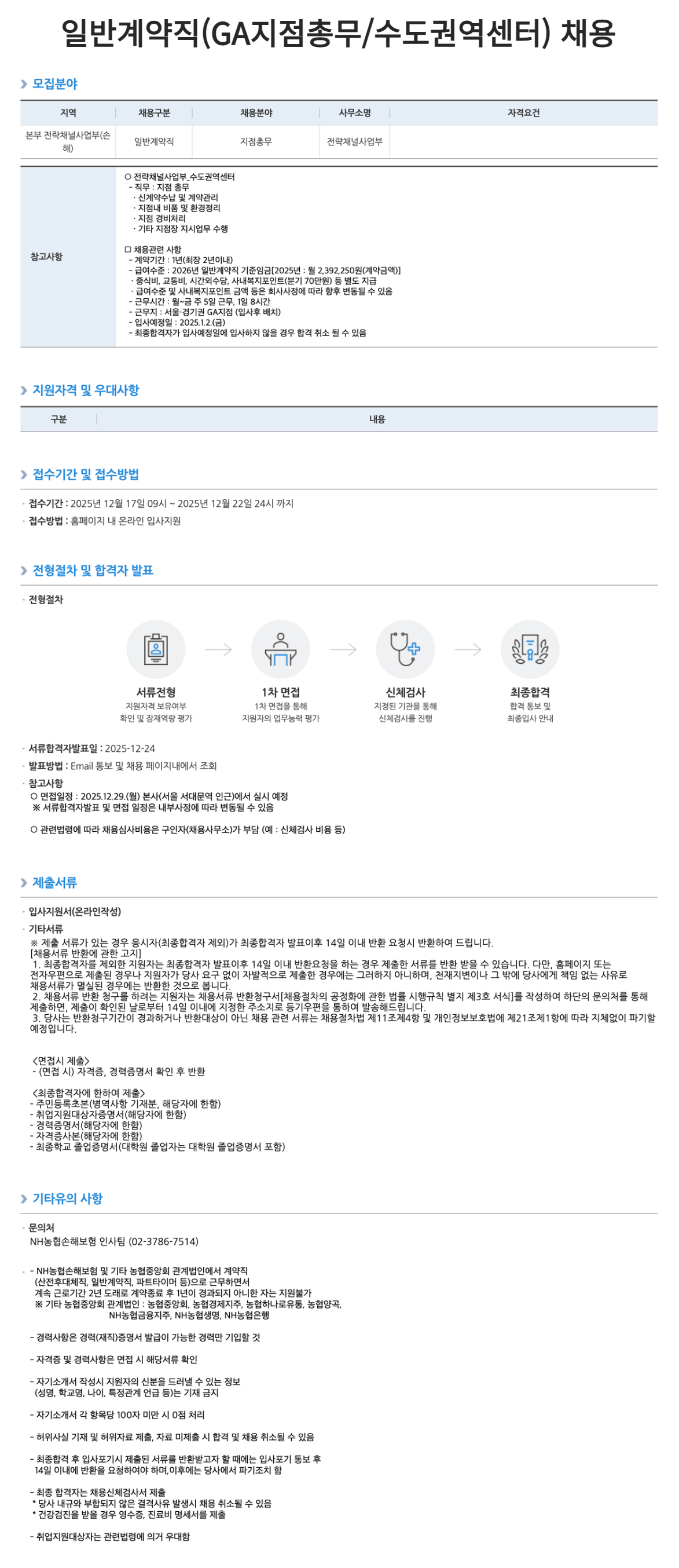 [NH농협손해보험] 일반계약직(GA지점총무) 채용 공고(수도권역센터)