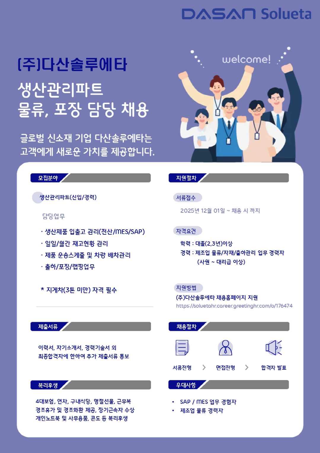 [다산솔루에타] 생산관리파트 물류 담당자 채용(신입/경력)