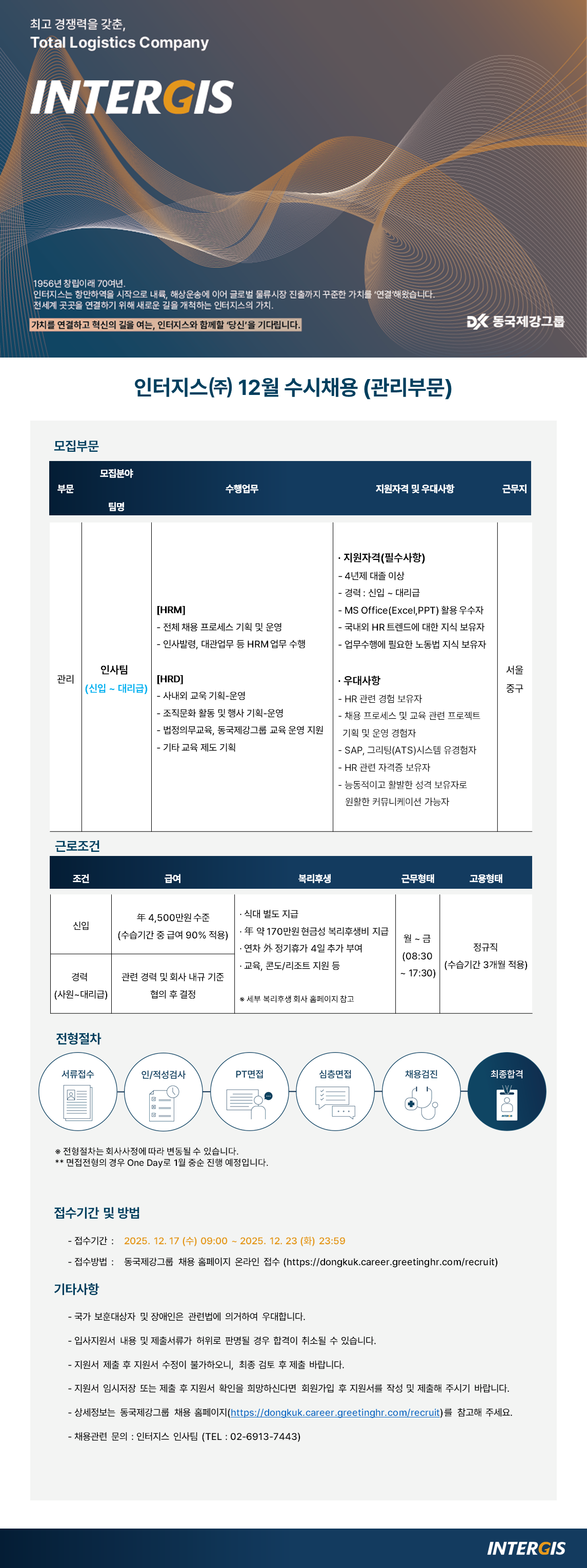 [인터지스] 12월 수시채용(관리부문) 공고 (인사팀)