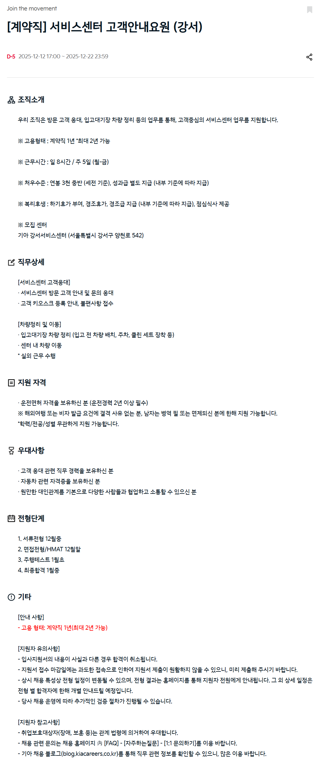 [기아] [계약직] 서비스센터 고객안내요원 (강서)