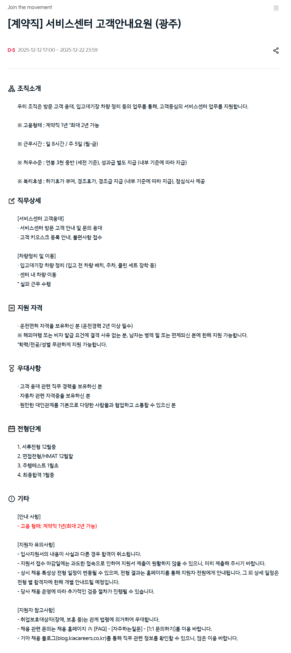 [기아] [계약직] 서비스센터 고객안내요원 (광주)