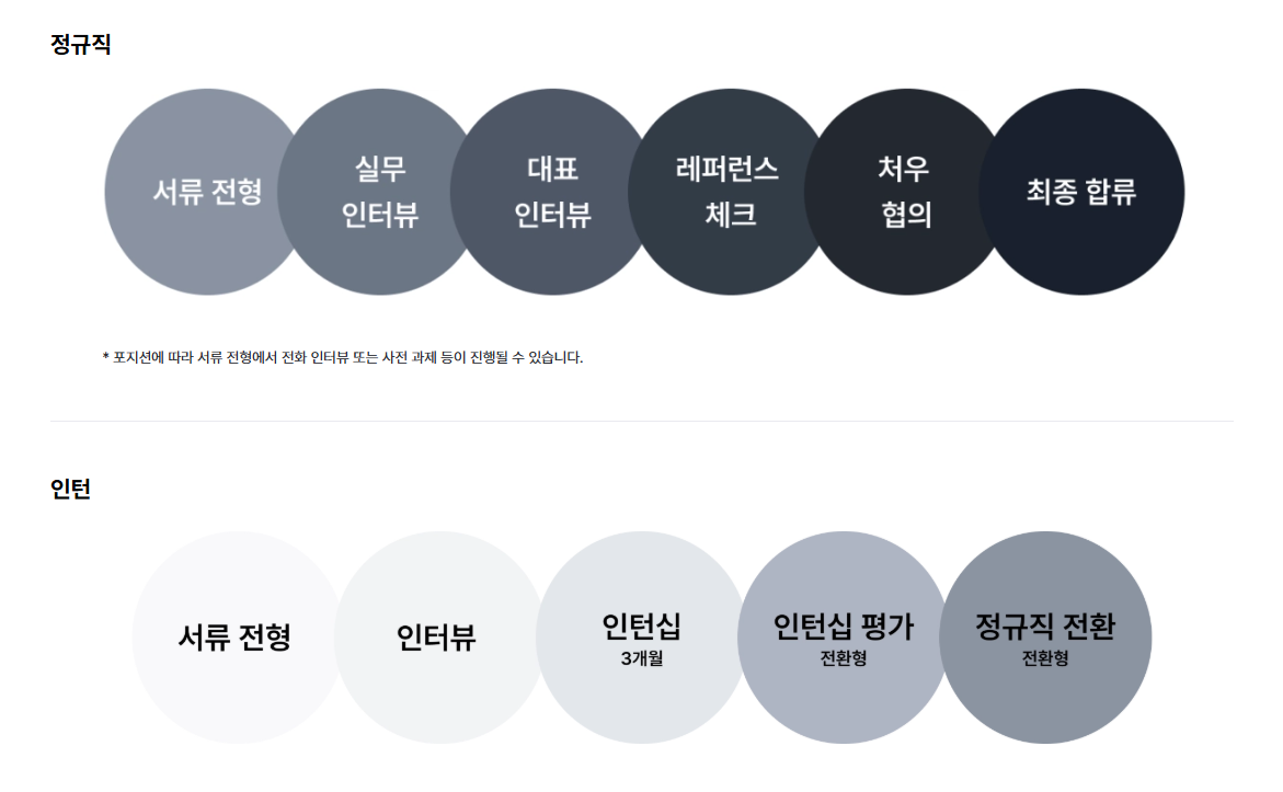 - 채용 프로세스는 위와 같이 진행됩니다. 상황에 따라 변동되는 경우 개별 안내 드립니다.