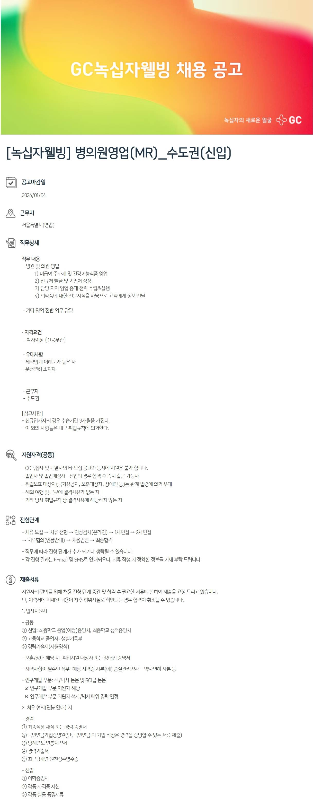 [녹십자웰빙] 병의원영업(MR) (신입_수도권)