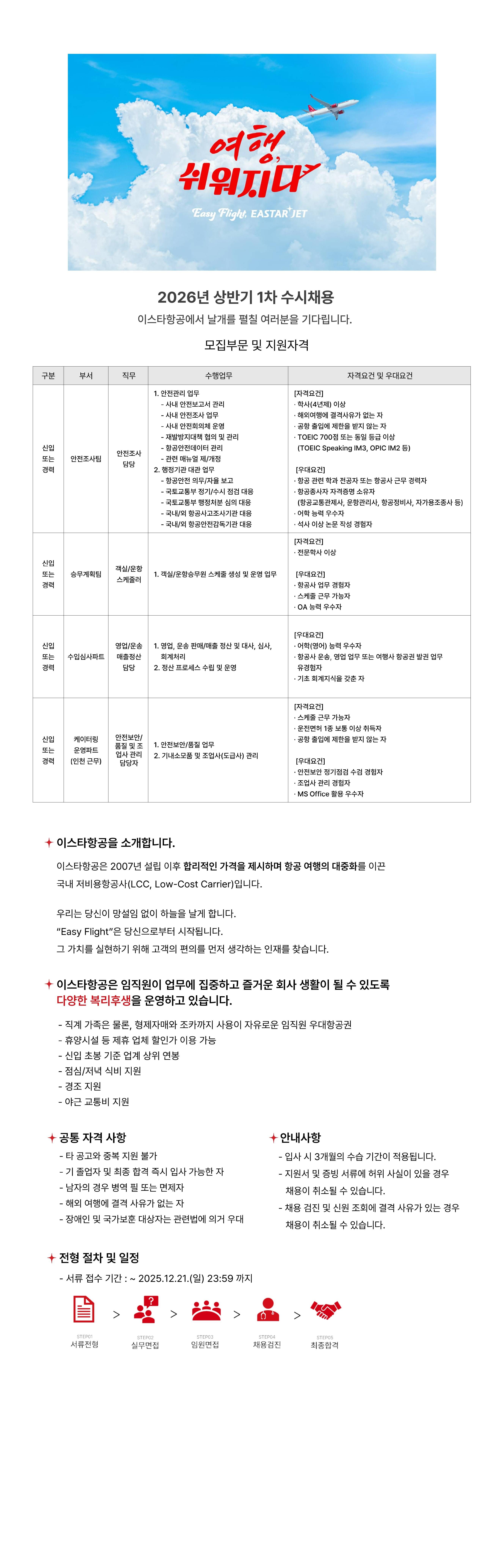 [이스타항공] 2026년 상반기 1차 수시채용(안전조사, 승무계획팀, 수입심사, 케이터링운영파트)