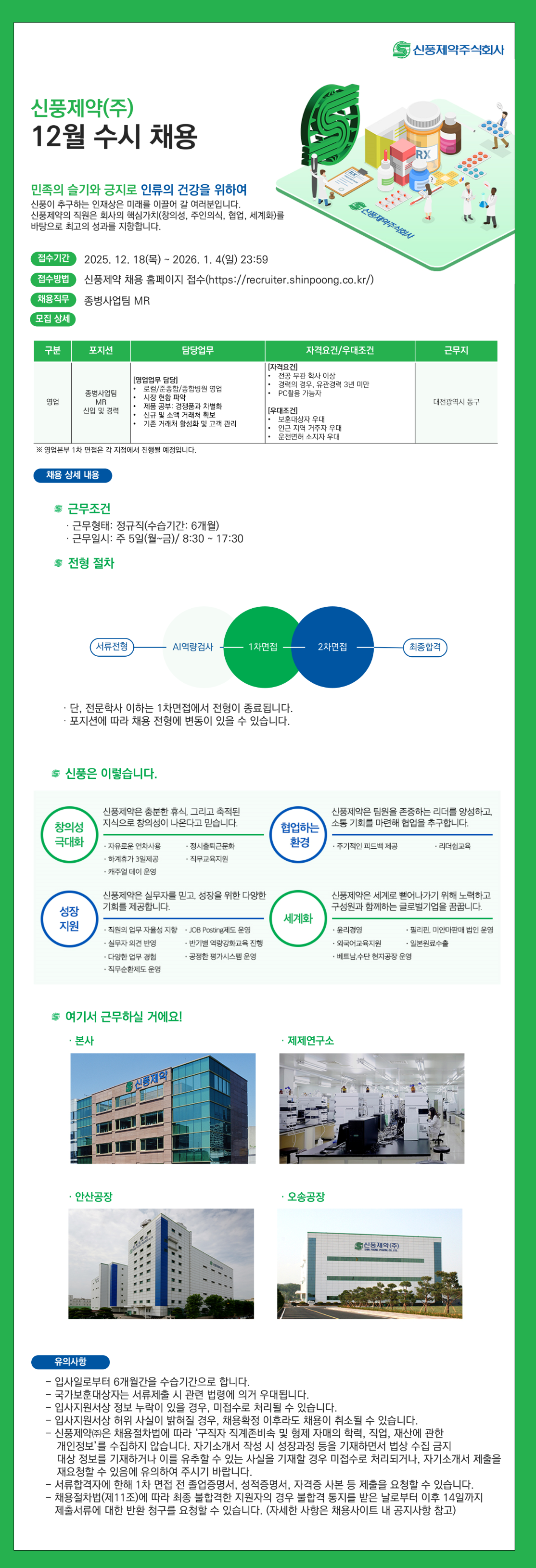 [신풍제약] 2025년 하반기 영업본부 종병사업팀 MR 신입 및 경력 채용