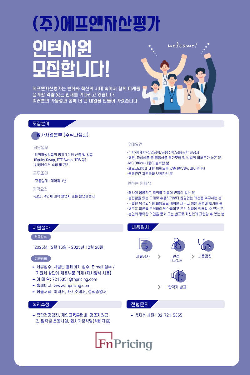 [에프앤자산평가] 평가사업본부(주식파생실) 인턴직원 채용(~12/28)