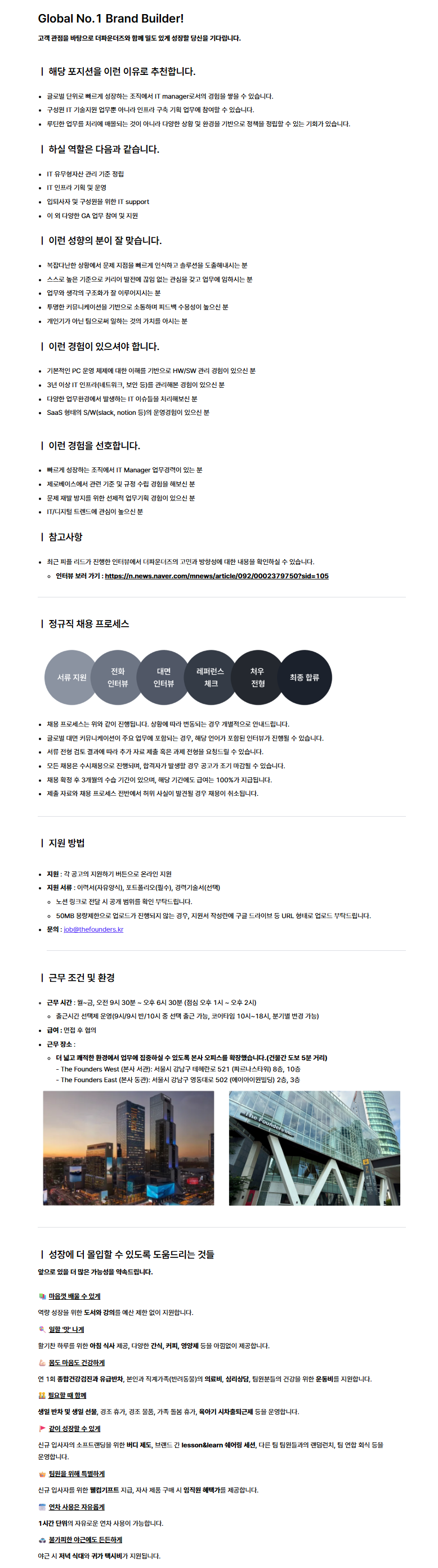 #IT매니저 #사내IT #IT인프라 #IT운영 #IT지원 #헬프데스크 #IT자산관리 #PC관리 #네트워크관리 #보안관리 #사내시스템 #SaaS운영 #슬랙 #노션 #스타트업IT #GA업무