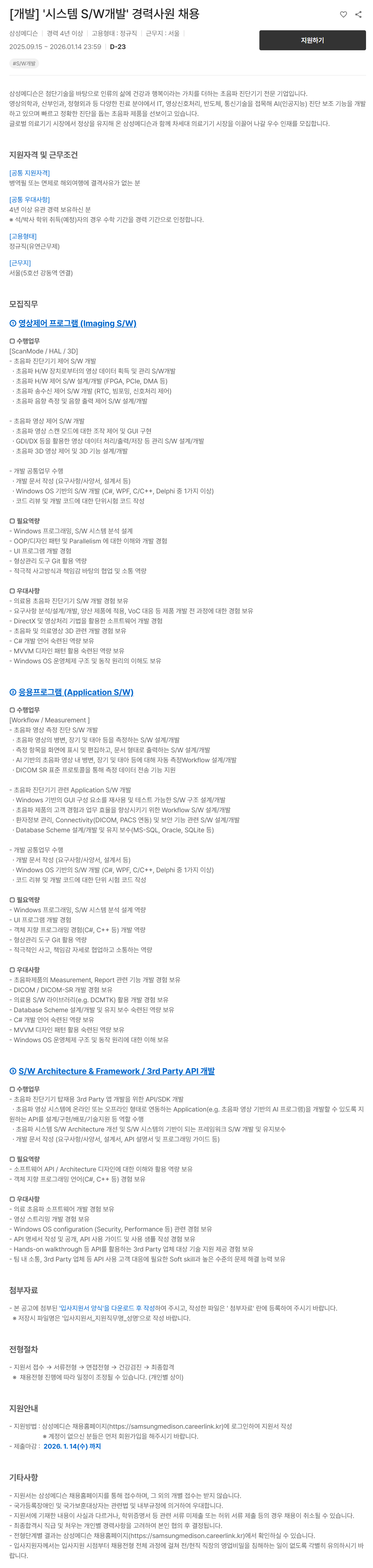 [삼성메디슨] [개발] 시스템 S/W개발 경력사원 채용