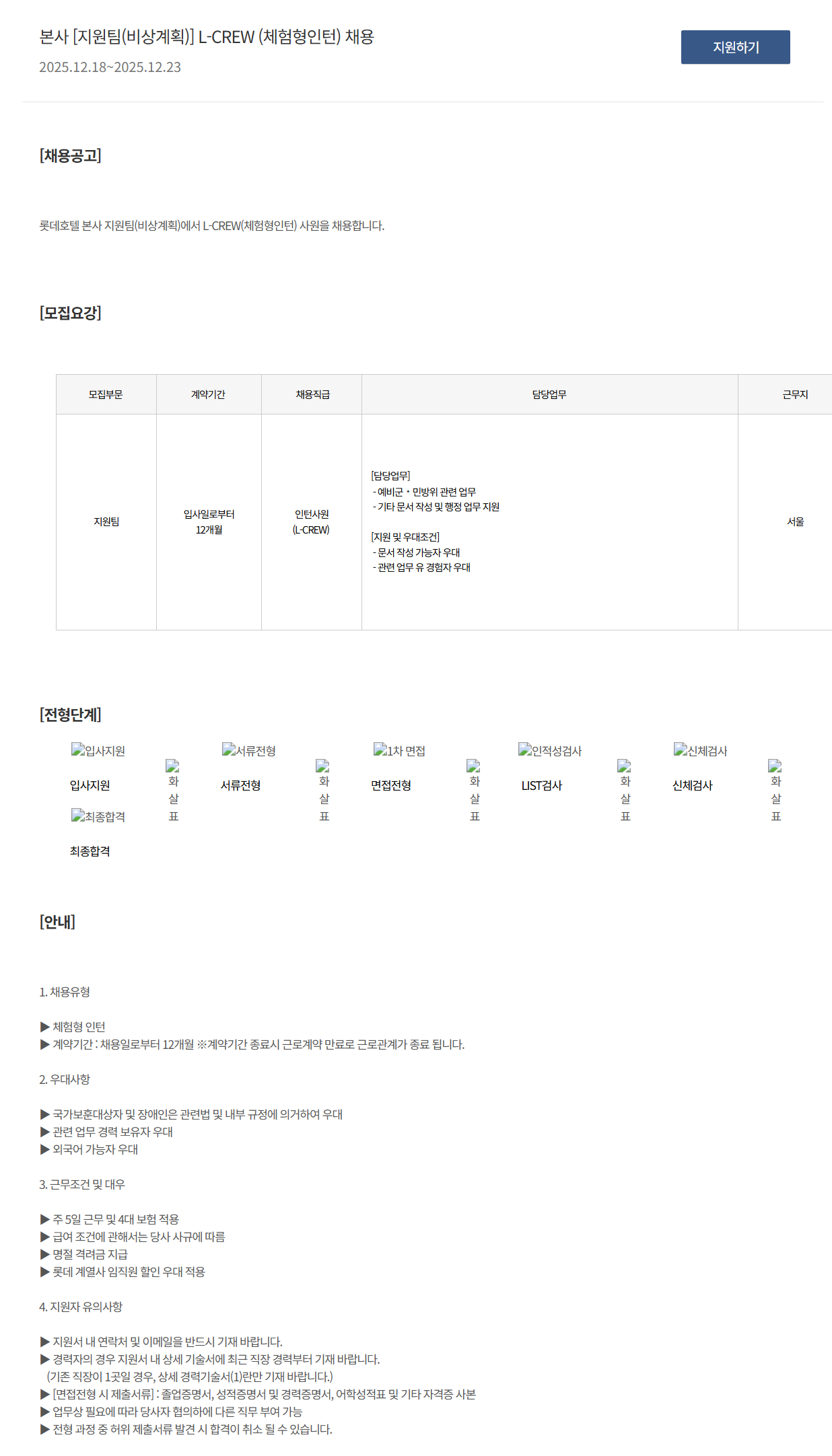 [호텔롯데] 본사 [지원팀(비상계획)] L-CREW (체험형인턴) 채용